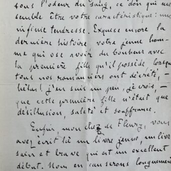 Superbe lettre élogieuse de Zola à Maurice de Fleury, sur son ouvrage « Amours de savants », dont il sera le dédicataire