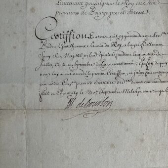 Certificat signé par le prince de Condé et son secrétaire des commandements, l’académicien Leriget marquis de La Faye