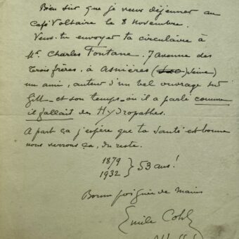 Lettre du pionnier du dessin animé, Émile Cohl, évoquant le club des hydropathes