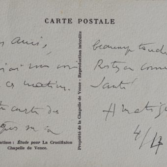 Carte d’Henri Matisse adressée à la veuve du peintre Charles Hall Thorndike