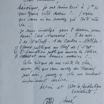 Siné inculpé pour 8 dessins parus dans Siné-Massacre, illustre sa lettre d’un poing levé