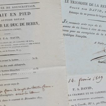 Deux reçus signés du graveur François-Anne David dont un pour le portrait du duc de Berry