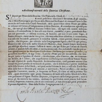Certificat de l’Archiconfrateria della dottrina christiana, signé par l’oblat italien Carlo Bartolomeo Piazza, en 1699