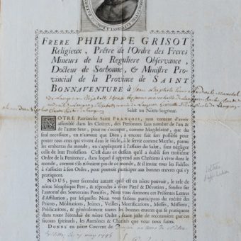 Lettre d’affiliation d’un frère cordelier du couvent du Donjon pour le maréchal de Langeron