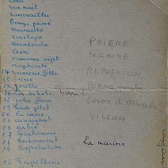 Longue liste de chansons, de la main de Brassens : Gorille, Auvergnat, Pornographe, Mauvais sujet, etc