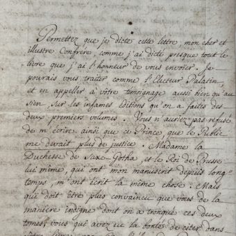Longue lettre de Françoise de Graffigny toute consacrée à Voltaire, qui vient séjourner chez elle, et à Mlle Clairon