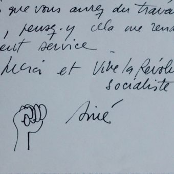 Siné inculpé pour 8 dessins parus dans Siné-Massacre, illustre sa lettre d’un poing levé
