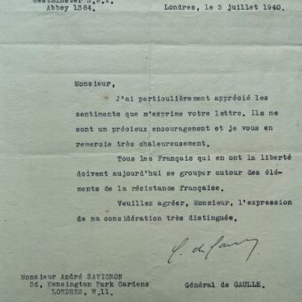 Echange de courriers entre le général de Gaulle et le prix Goncourt André Savignon après l’appel du 18-juin
