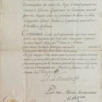 Document signé par Pierre de Malézieu et le duc du Maine pour le régiment Suisse de Karrer