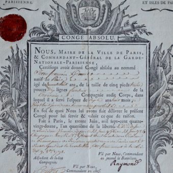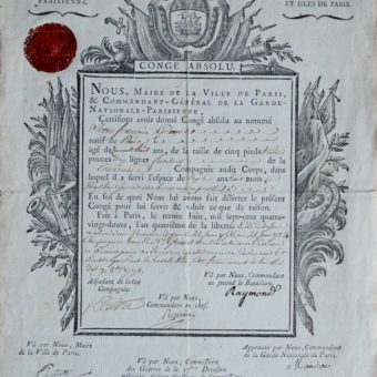 Congé absolu accordé à un fusilier de la Garde nationale de Paris, 1792, signé par Mandat de Grancey