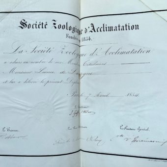 Diplôme de la Société Zoologique d’Acclimatation décerné à l’agronome Léonce Guilhaud de Lavergne (1854)