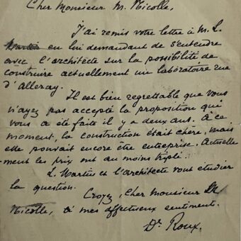 Lettre d’Émile Roux à Maurice Nicolle au sujet de la construction d’un laboratoire pour l’Institut Pasteur