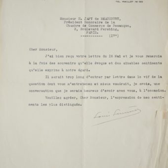Lettre de Louis Lumière à Henri Japy de Beaumont