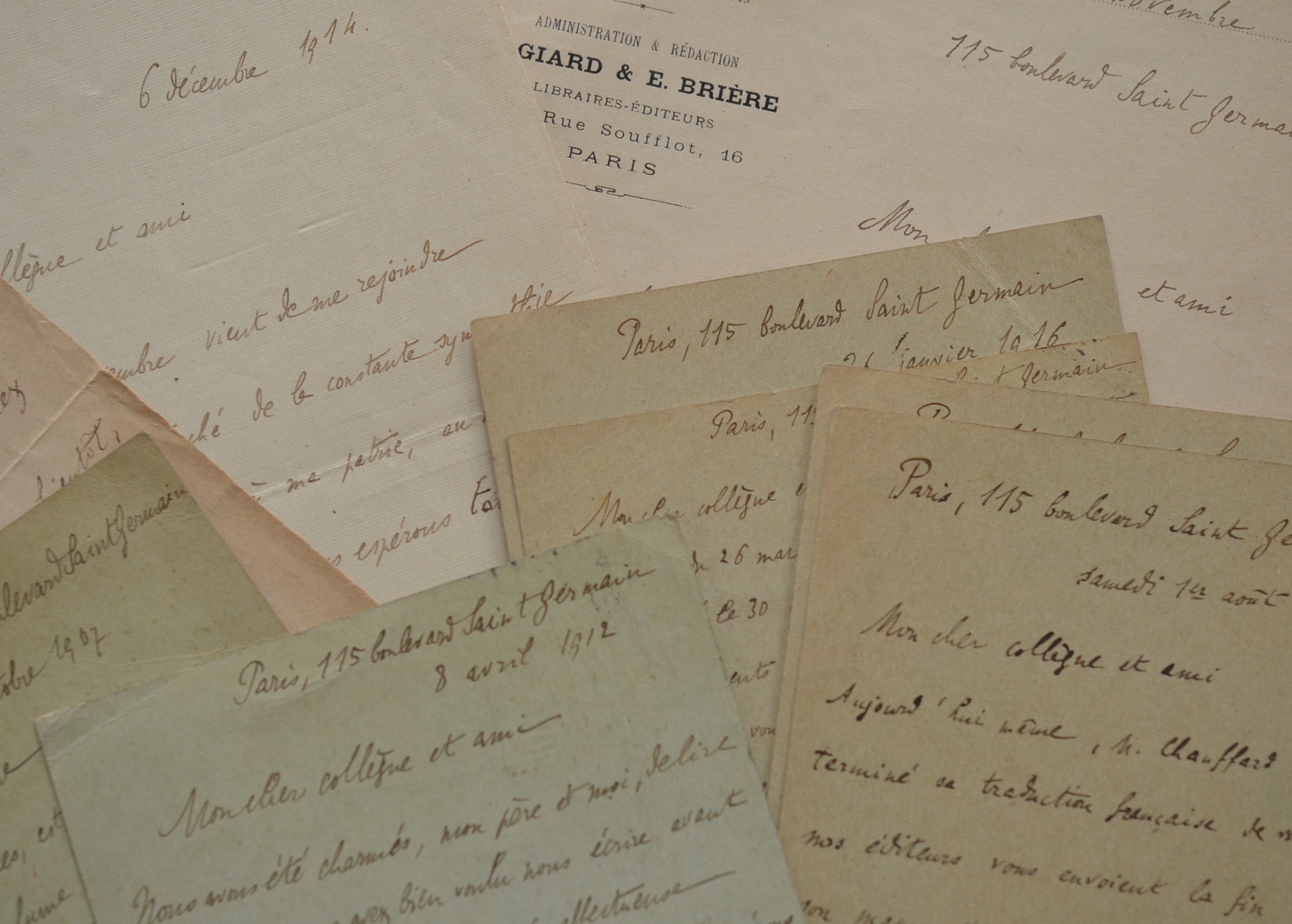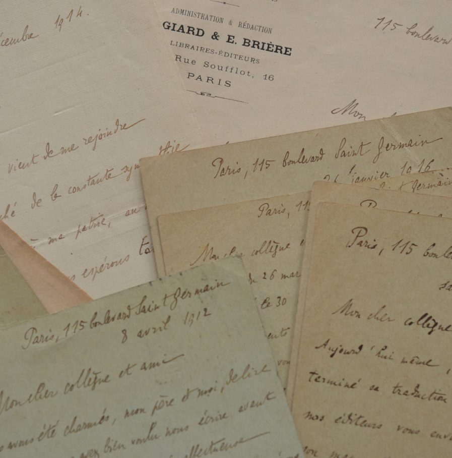 René Worms (Rennes, 1869/1926)Intéressantes lettres sur trois décennies du sociologue René Worms à son confrère Antonio Dellepiane. Avec son père, le professeur d'économie politique Emile Worms, il se charge de diffuser les travaux de son ami en France : distribution de ses textes à la Société de Sociologie de Paris, éditions françaises de ses ouvrages, comptes-rendus dans les revues spécialisées, etc. Il évoque aussi la guerre : « Je suis très touché de la constante sympathie que vous voulez bien témoigner à ma patrie, au milieu des difficultés qu'elle traverse. Nous espérons tous qu'elle les surmontera, et des amitiés comme la vôtre nous encouragent à les supporter. » L'une des lettres comprend le brouillon autographe de la réponse d'Antonio Dellepiane à René Worms.