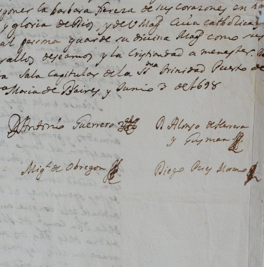 [AMÉRIQUE DU SUD - BUENOS AIRES]. Lettre signée par quatre notables : D. Antonio Guerrero, D. Alonso de Herrera y Guzman, Miguel de Obregon et Diego Perez Moreno. En espagnol.