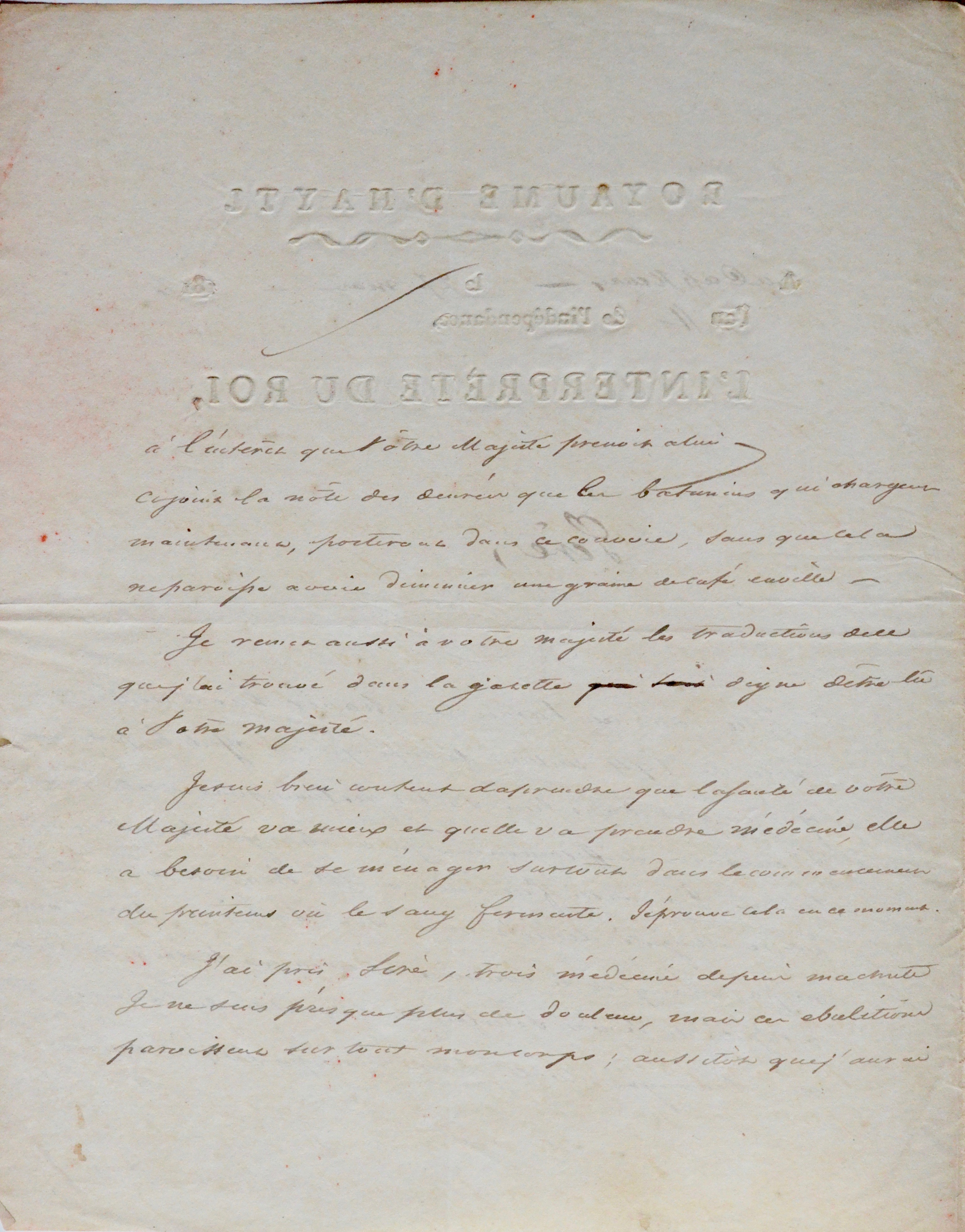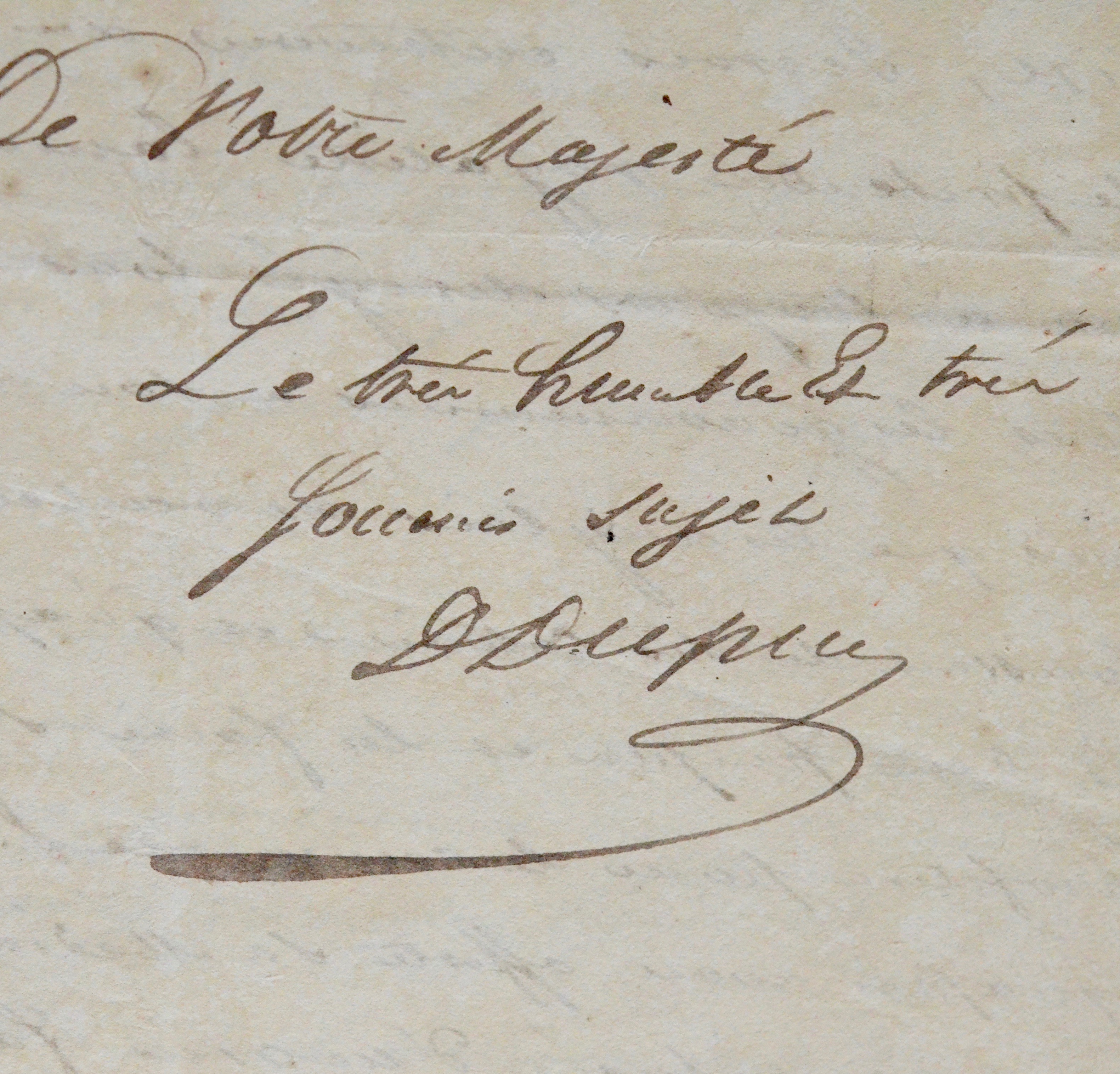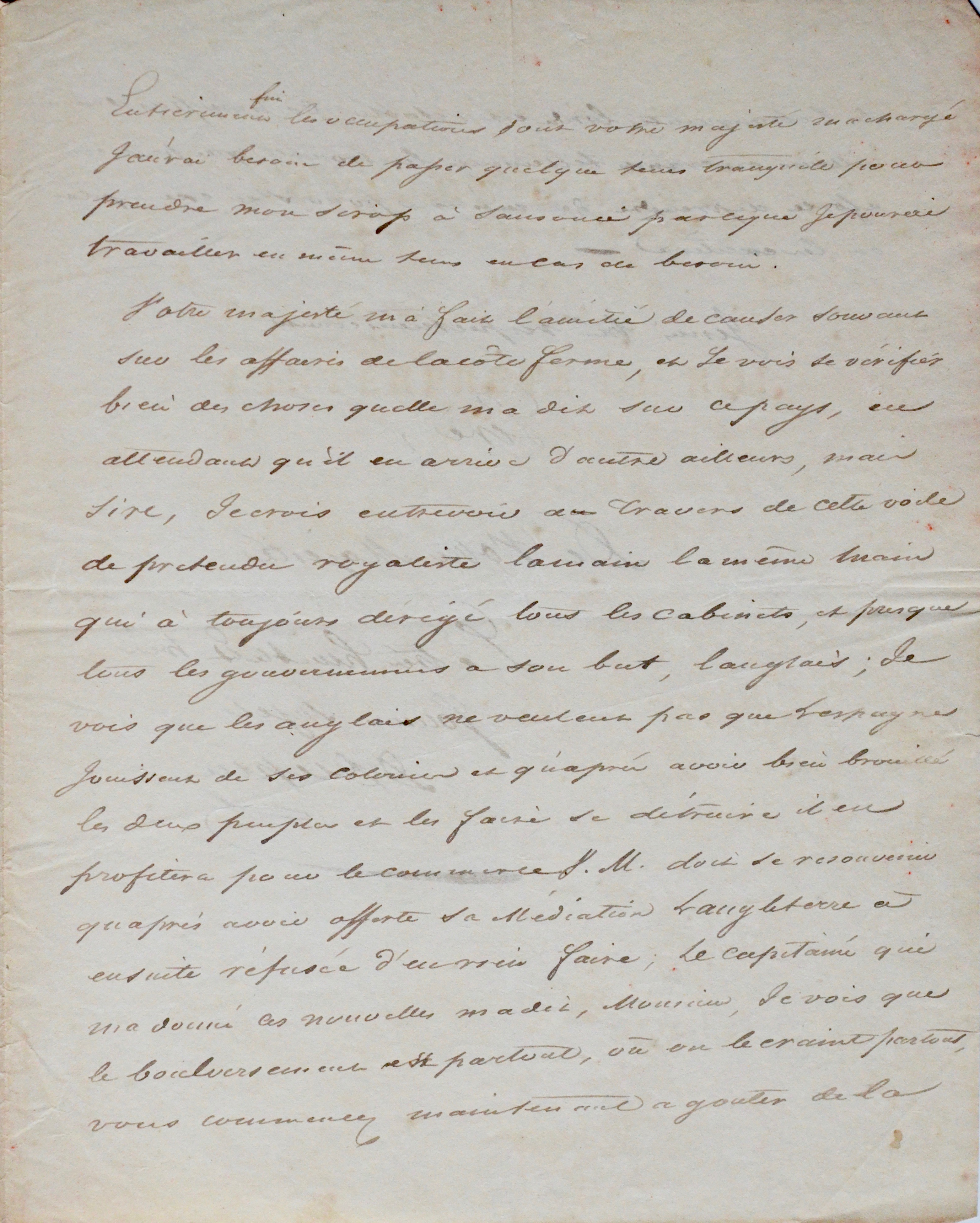 [Henri Ier d'Haïti]. Lettre autographe signée du Baron de DUPUY, secrétaire interprète et conseiller du Roi d'Haïti, adressée à ce dernier. Orthographe fantaisiste.