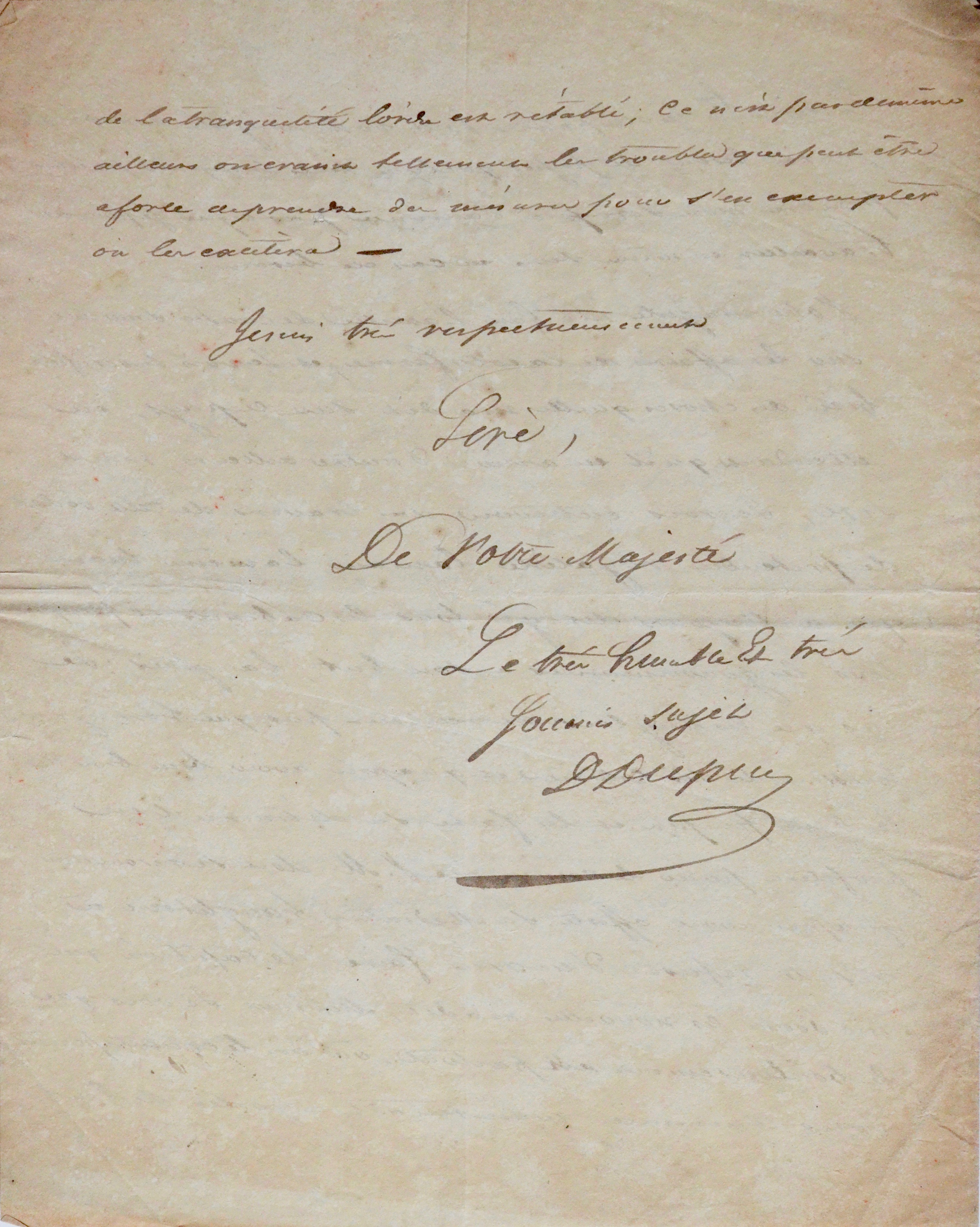"J'ai remis au baron de Charier hier a midi, une note de 194 milliers de café qu'ont offert les personnes qui en ont dans leur soute. J'estime qu'avec cette quantité il en aura suffisamment pour charger le brick immédiatement [...]". Il s'enquiert ensuite de la santé du Roi et détaille ses propres problèmes.