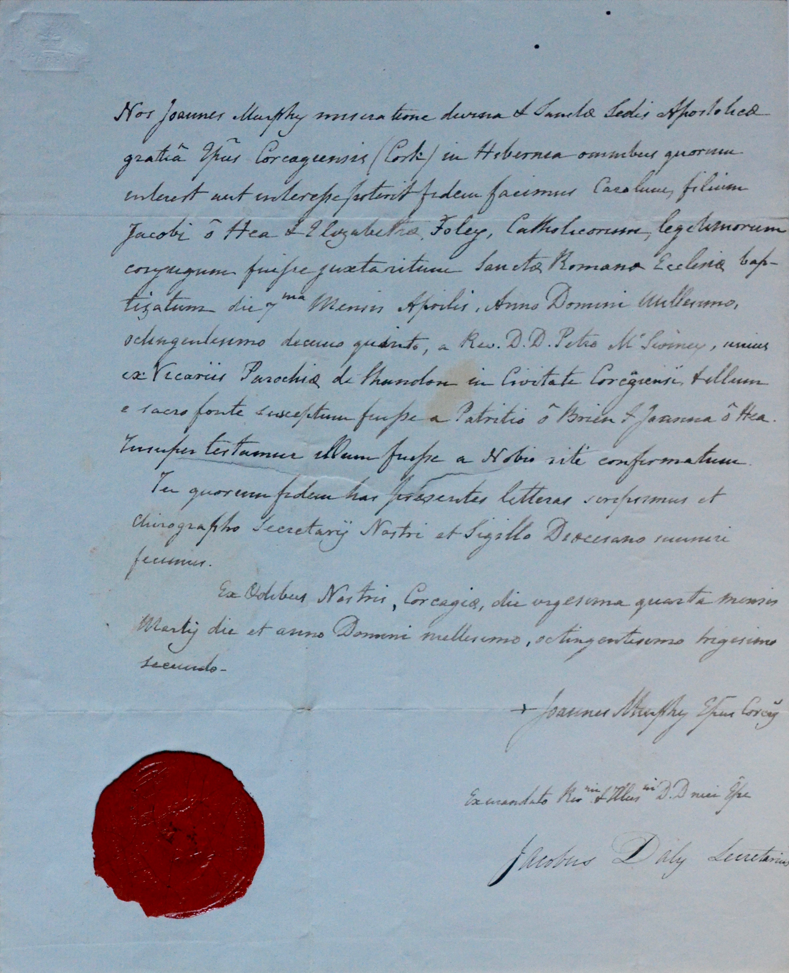 1832 : certificat de l’évêque irlandais de Cork, John Murphy