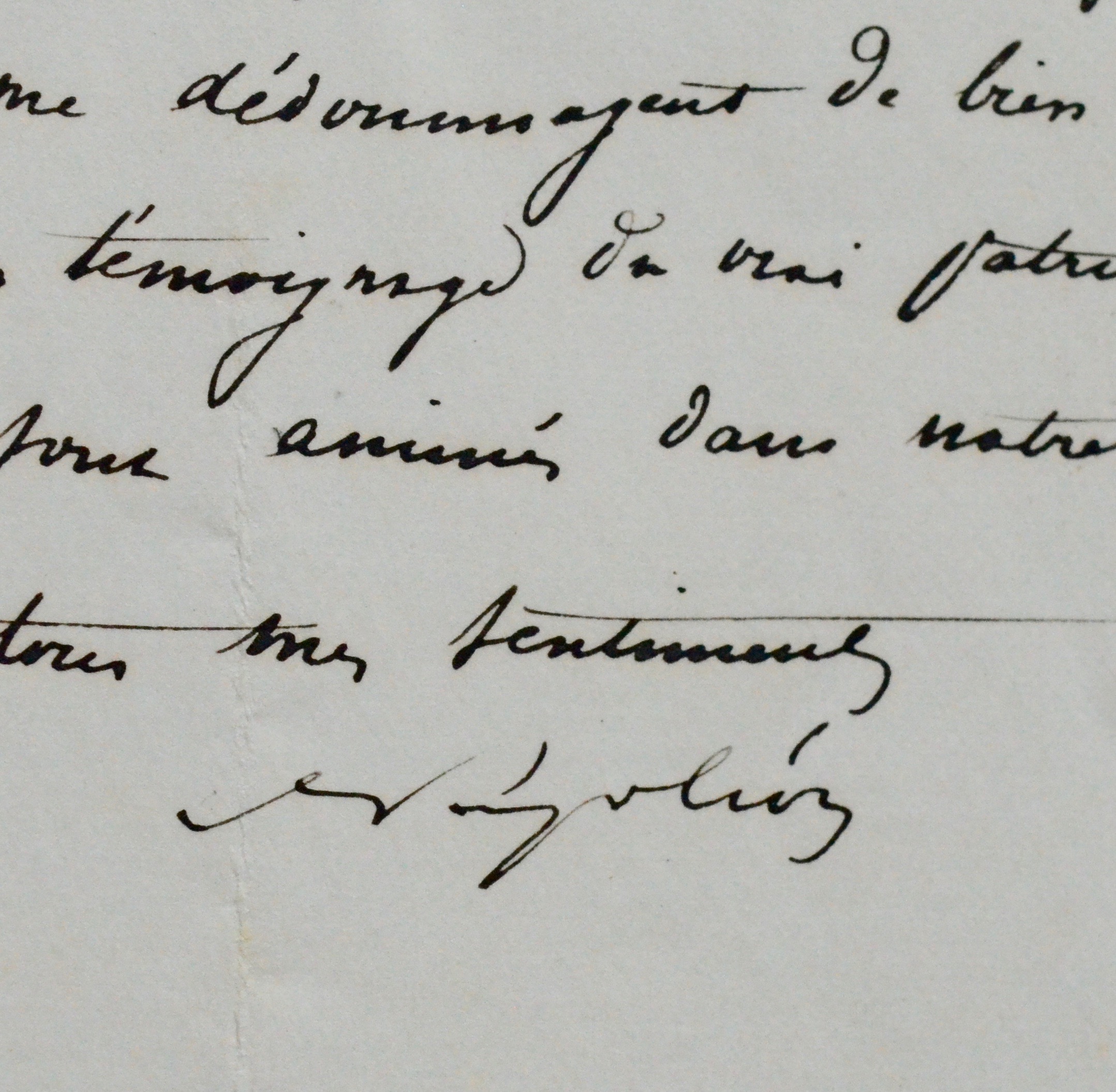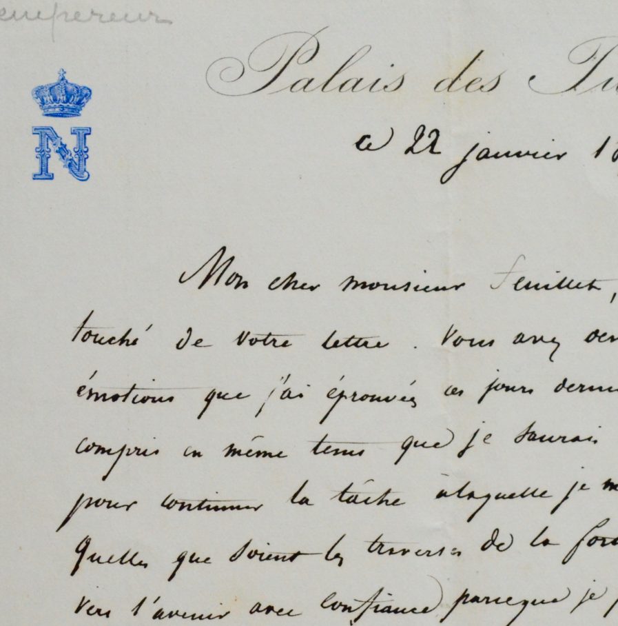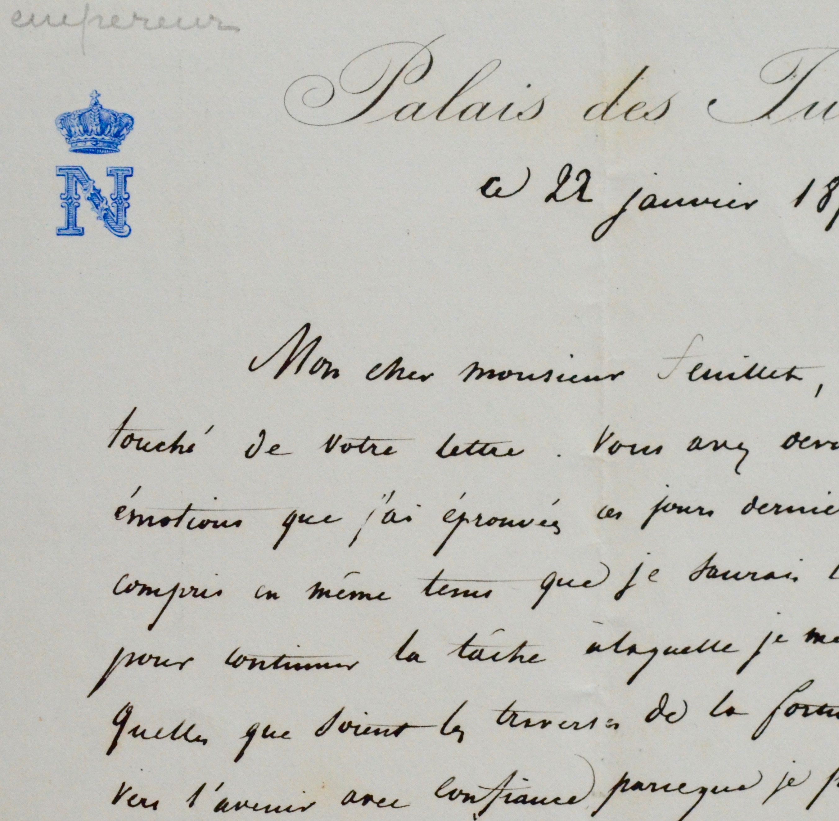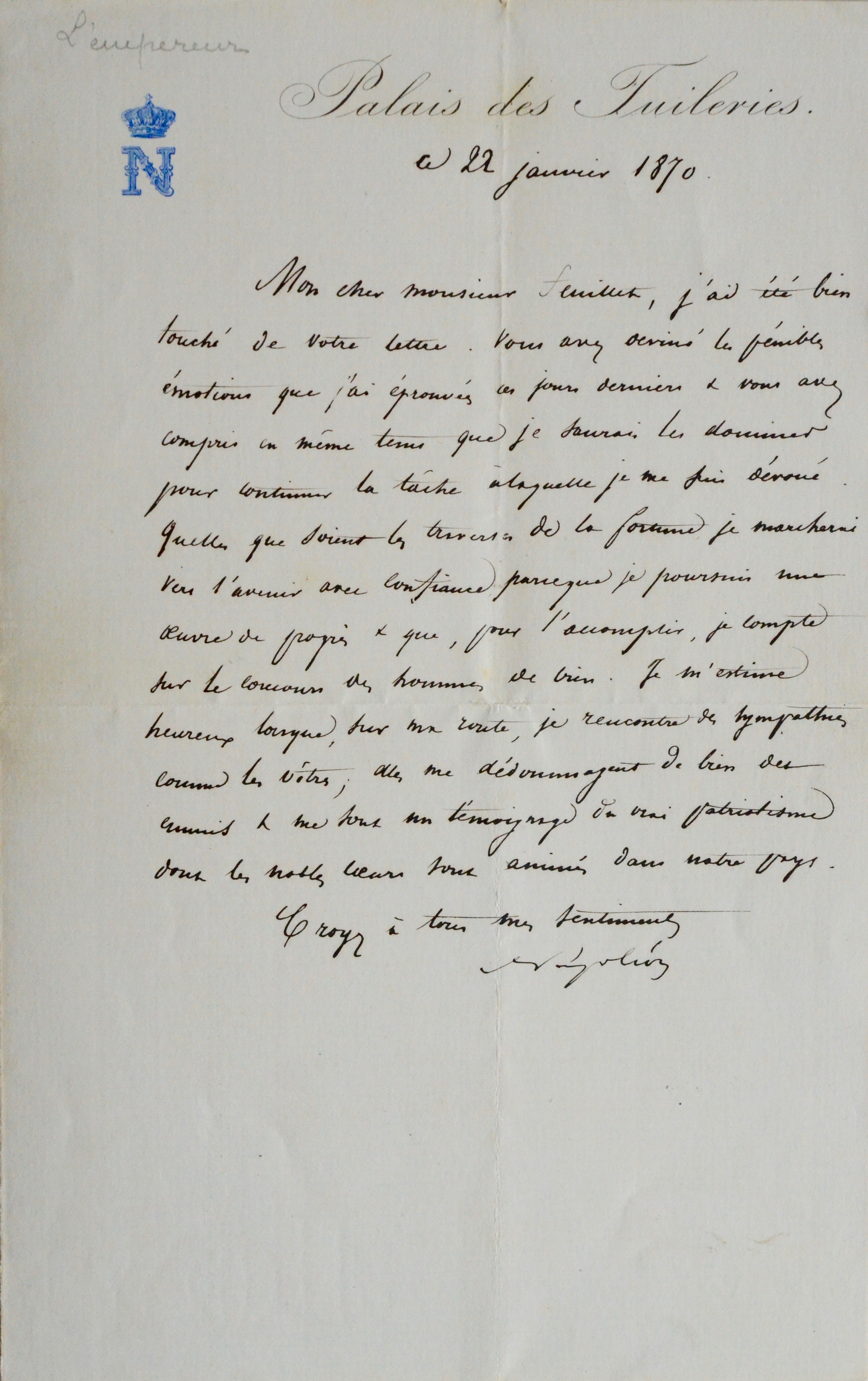 Très belle lettre de Napoléon III : "Vous avez deviné les pénibles émotions que j'ai éprouvées ces jours derniers & vous avez compris en même temps que je saurai les dominer pour continuer la tâche à laquelle je me suis dévoué quelles que soient les traverses de la fortune je marcherai vers l'avenir avec confiance parce que je poursuis une oeuvre de progrès & que, pour l'accomplir, je compte sur le concours des hommes de bien. Je m'estime heureux lorsque, sur ma route, je rencontre des sympathies comme les vôtres, elles me dédommagent de bien des ennuis & me sont un témoignage de vrai patriotisme dont les nobles coeurs sont animés dans notre pays [...]".