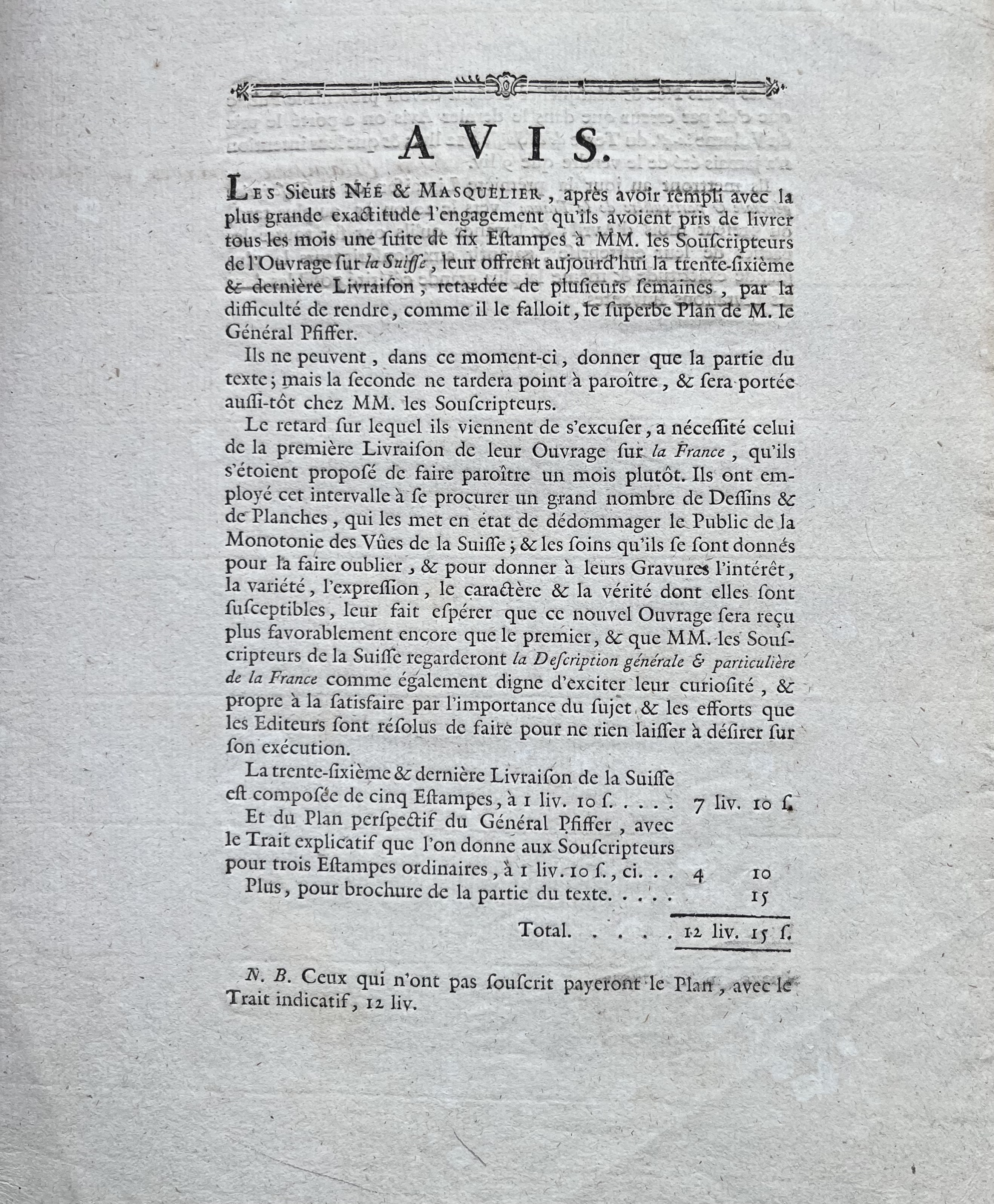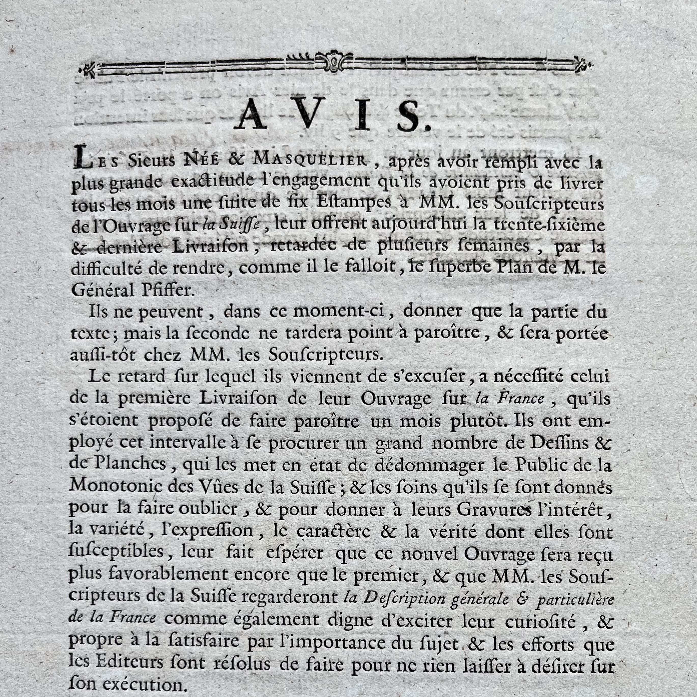 - «Avis» des graveurs François-Denis Née et Louis-Joseph Masquelier, annonçant la parution de la 36e et dernière livraison des Tableaux pittoresques de la Suisse, «retardée de plusieurs semaines, par la difficulté de rendre, comme il le falloit, le superbe plan de M. le général Pfiffer». [1777]