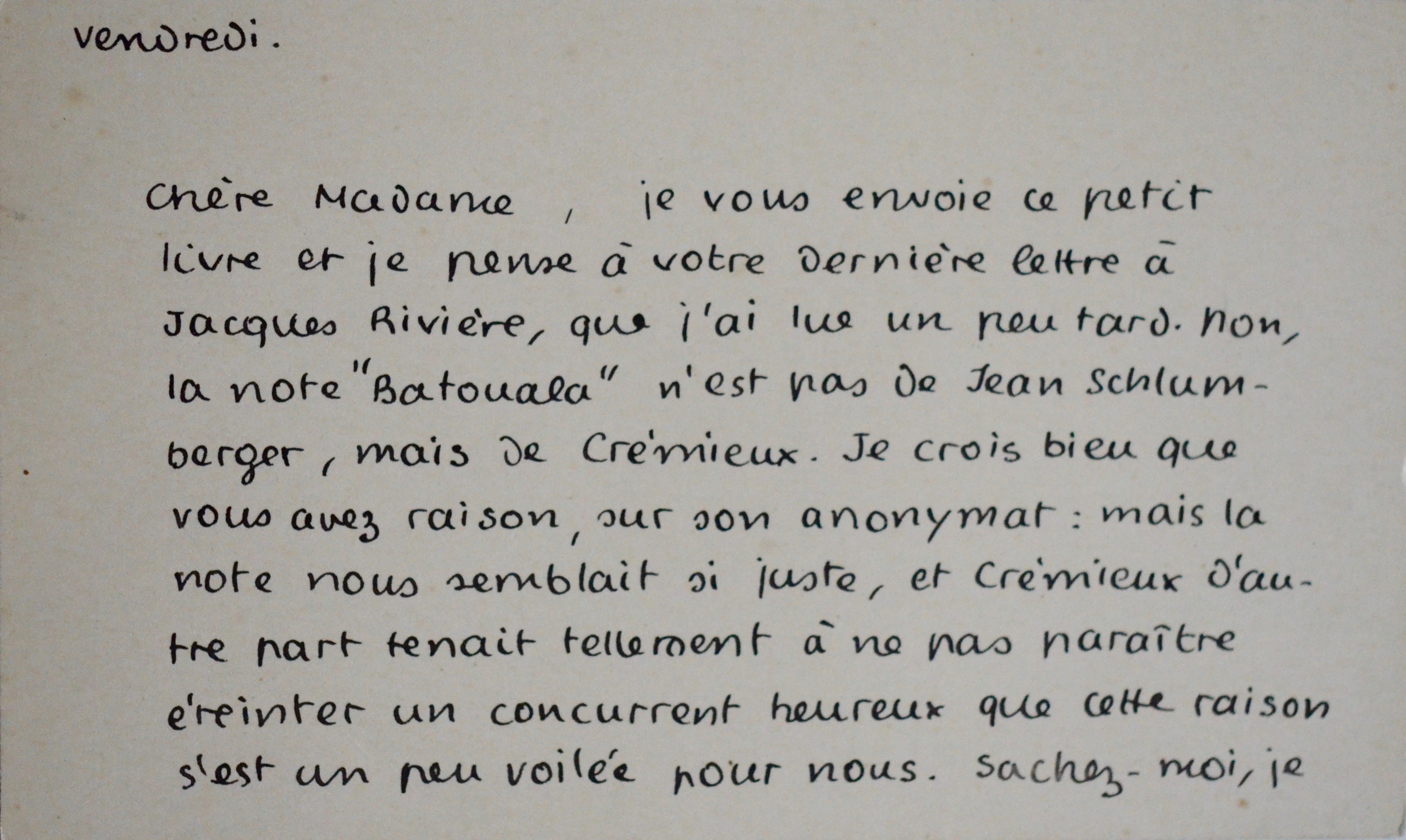 "Je vous envoie ce petit livre et je pense à votre dernière lettre à Jacques Rivière, que j'ai lue un peu tard. Non, la note "Batouala" n'est pas de Jean Schlumberger, mais de [Benjamin] Crémieux. Je crois bien que vous avez raison sur son anonymat : mais la note nous semblait si juste, et Crémieux d'autre part tenait tellement à ne pas paraître éreinter un concurrent heureux que cette raison s'est un peu voilée pour nous [...]".