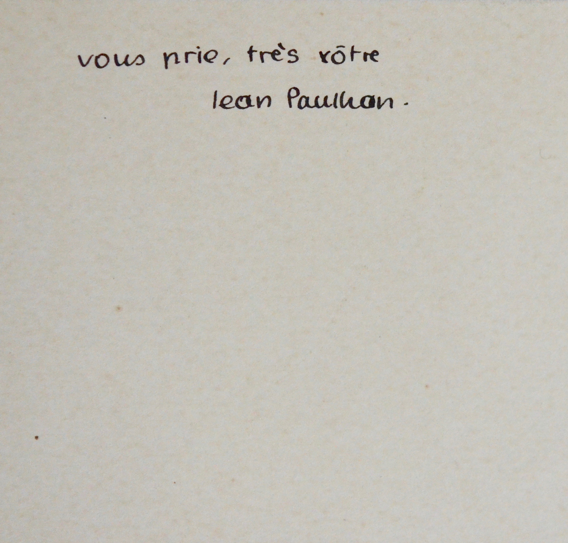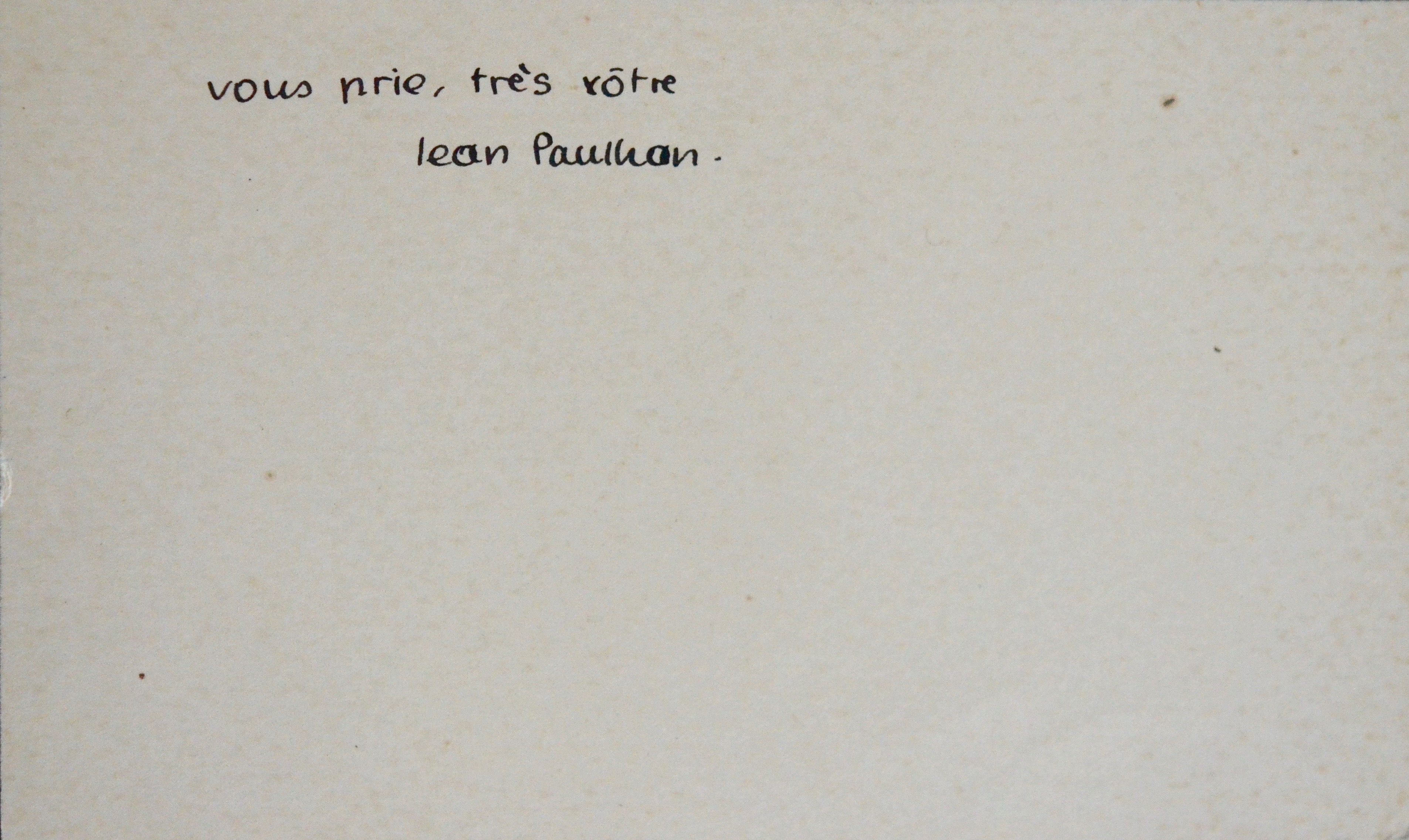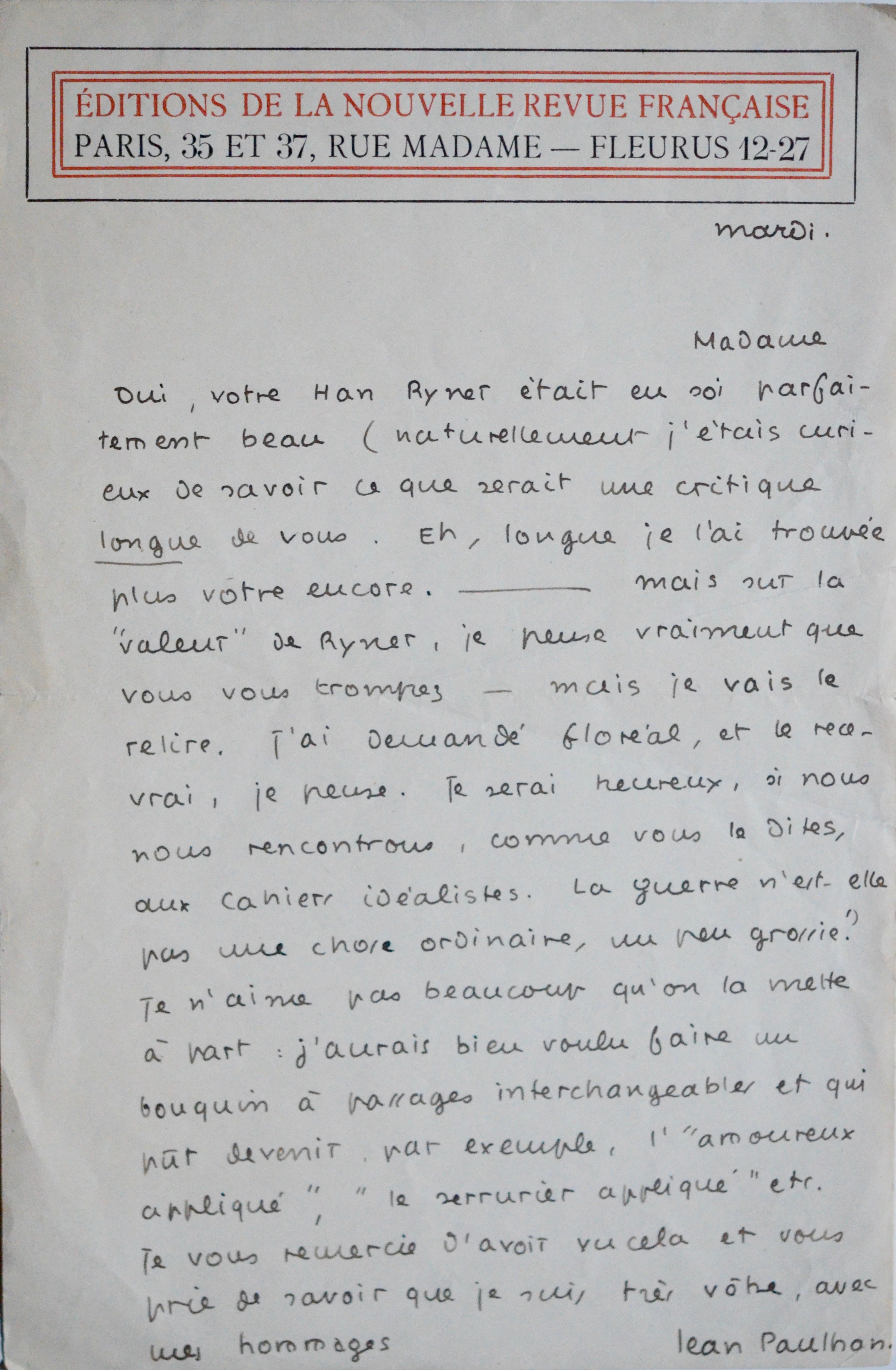 2 lettres de Jean Paulhan à Renée Dunan évoquant Han Ryner et Batouala de René Maran