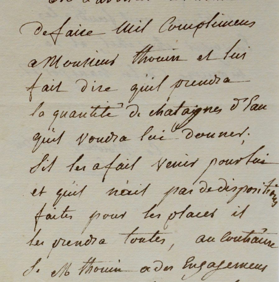 • "mercredy matin" : « M. Lavoisier a l'honneur de faire mil complimens à monsieur Thouin et lui fait dire qu'il prendra la quantité de châtaignes d'eau qu'il voudra lui donner. S'il les a fait venir pour lui et qu'il n'ait pas de dispositions faites pour les placer il les prendra toutes, au contraire si M. Thouin a des engagemens à remplir M. Lavoisier lui sera fort obligé de lui en céder une centaine, s'il le peut. Il prie son cher confrère de lui faire dire le jour et l'heure où il faudra les envoyer chercher et la manière de les transporter ».
