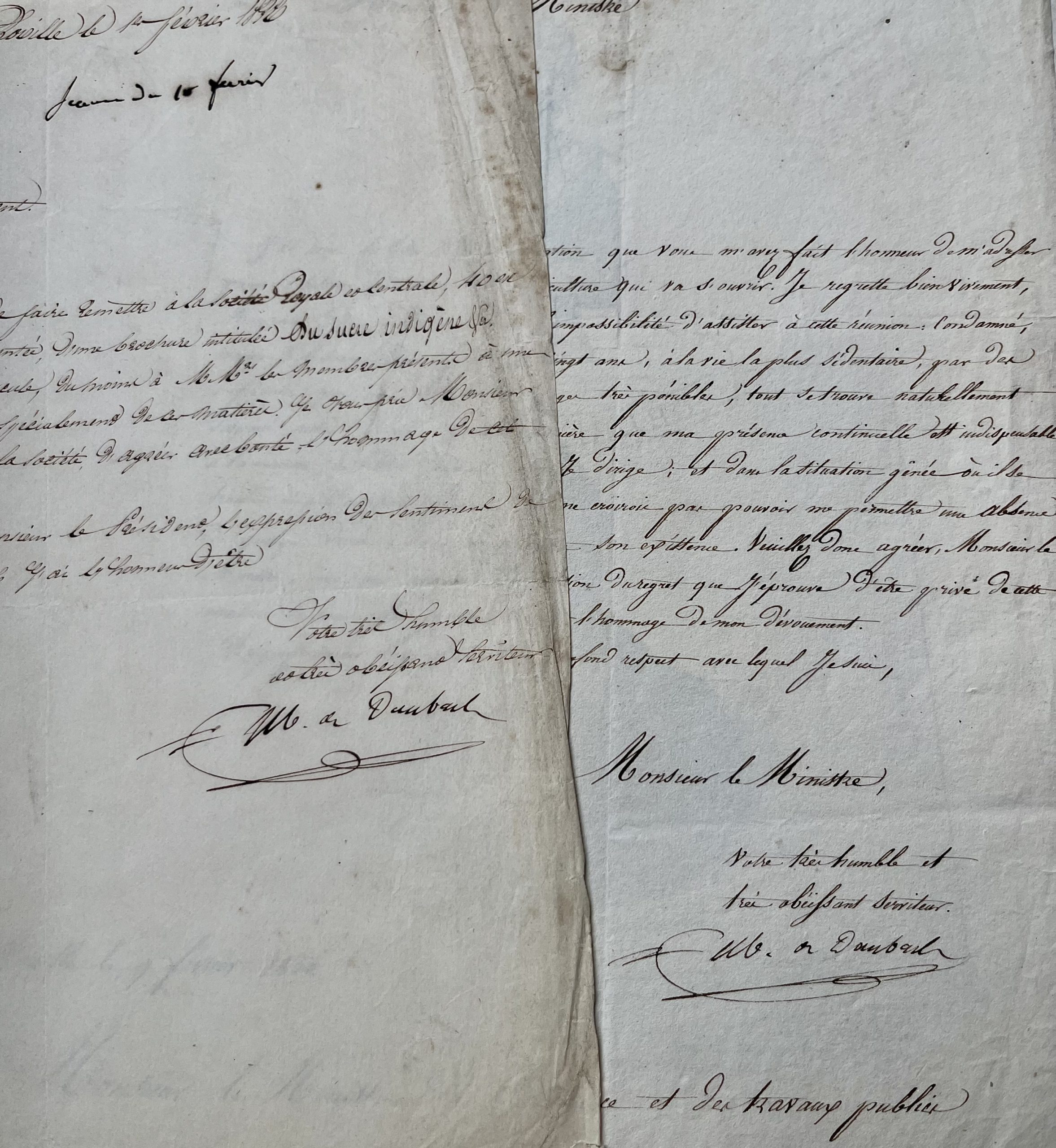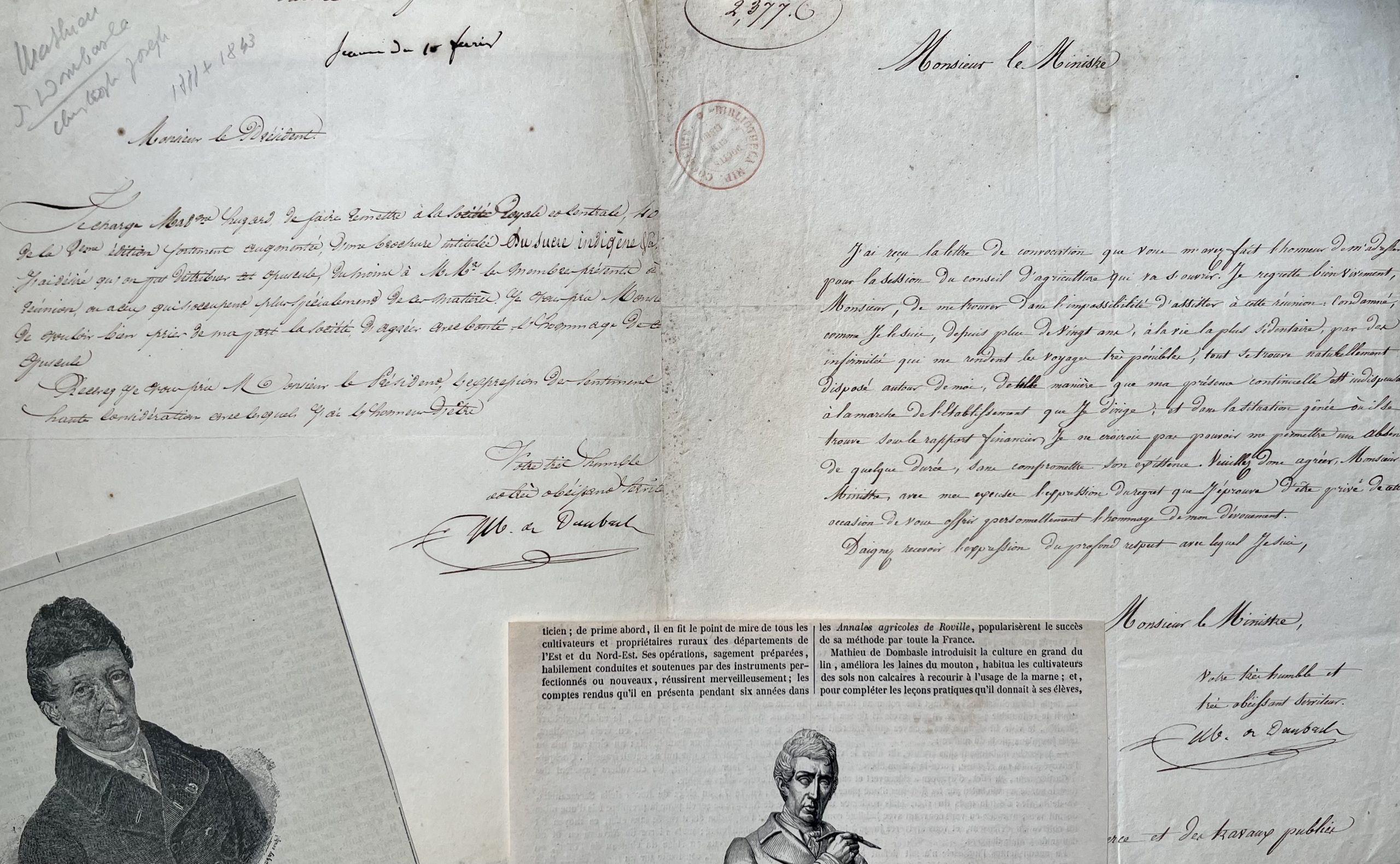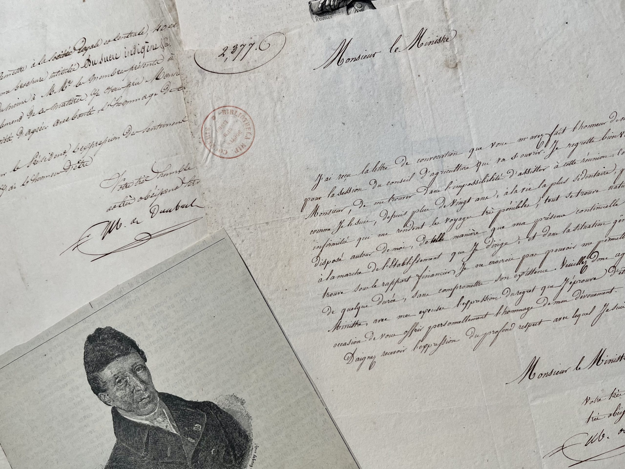 Deux lettres de l'agronome Mathieu de Dombasle, la première (au président de la Société Royale et Centrale d'Agriculture) sur la publication de sa brochure "Le Sucre indigène", la seconde sur l'impossibilité de se rendre à une réunion, étant condamné à une vie sédentaire à cause de ses infirmités.