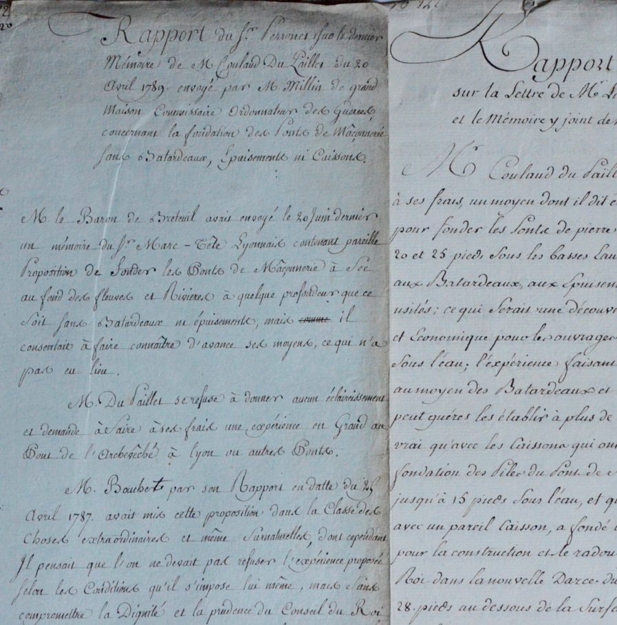 - 5 mai 1789. "Rapport du Sr Perronet sur le dernier mémoire de M. Coulaud du Paillet [...] concernant la fondation des ponts de maçonnerie sans batardeaux, épuisements ni caissons », dans lequel il se montre plus sceptique sur la réussite de cette construction. "On doit au surplus laisser à la prudence de M. les prévost des Marchands et des officiers municipaux de la ville de Lyon qui sont chargés de la construction du nouveau Pont de l'Archevêché la liberté d'adopter cette méthode pour l'une des piles de ce Pont, s'ils jugent à propos d'en courir les risques […]".