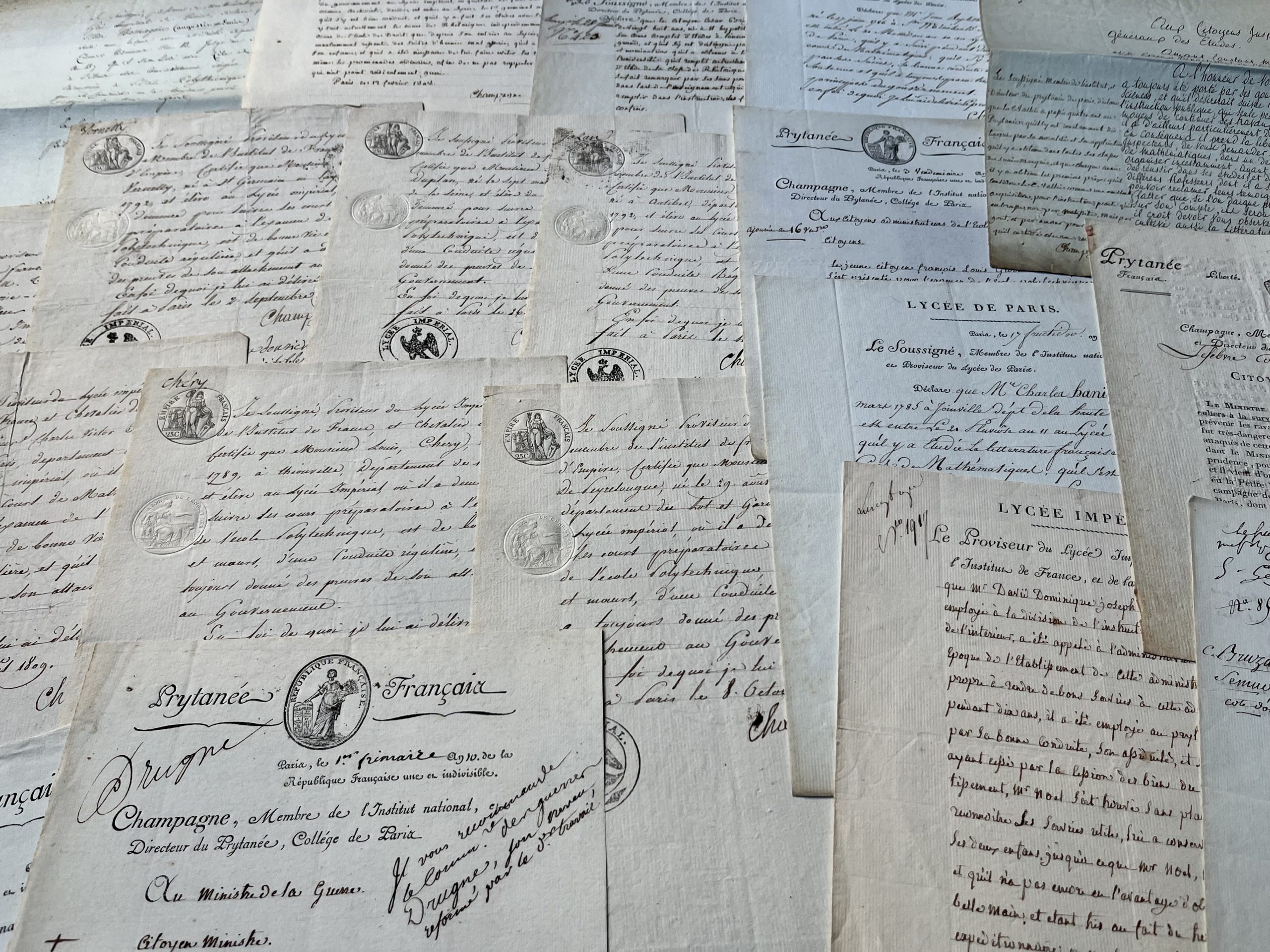 Ensemble de 20 pièces et lettres signées (ou autographes signées) de Jean-François Champagne (qui avait été élève de Louis-le-Grand avant d'en devenir professeur puis proviseur jusqu'en 1810) : certificats (avec appréciations) délivrés à des élèves du Lycée Impérial (ou du Prytanée français), servant en particulier à entrer à l'École Polytechnique. Quelques-uns sont également signés par d'autres professeurs.