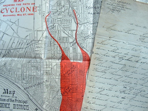 Lettre de Joséphine Knoblauch, témoin de l'ouragan qui a ravagé la ville de Saint-Louis (Missouri), le 27 mai 1896. «Le cyclone a continué ses dégats à East St Louis, Illinois, de l'autre côté du Mississipi et y a détruit mille et cinquante batiments depuis les grands hangars de marchandises des chemins de fer, usines, écoles, hôtels et jusqu'aux moindres baraques. A St-Louis même, le territoire dévasté a 2 milles anglais de long, sur près de 1 mille de large. Je ne puis vous donner le compte exact, mais je crois que 3500 maisons ont été plus ou moins endommagées, de ce nombre, un tiers est totalement démoli. J'ajouterai que ces bâtiments étaient en briques [...]».