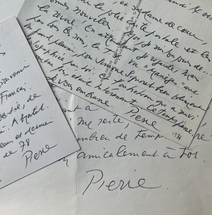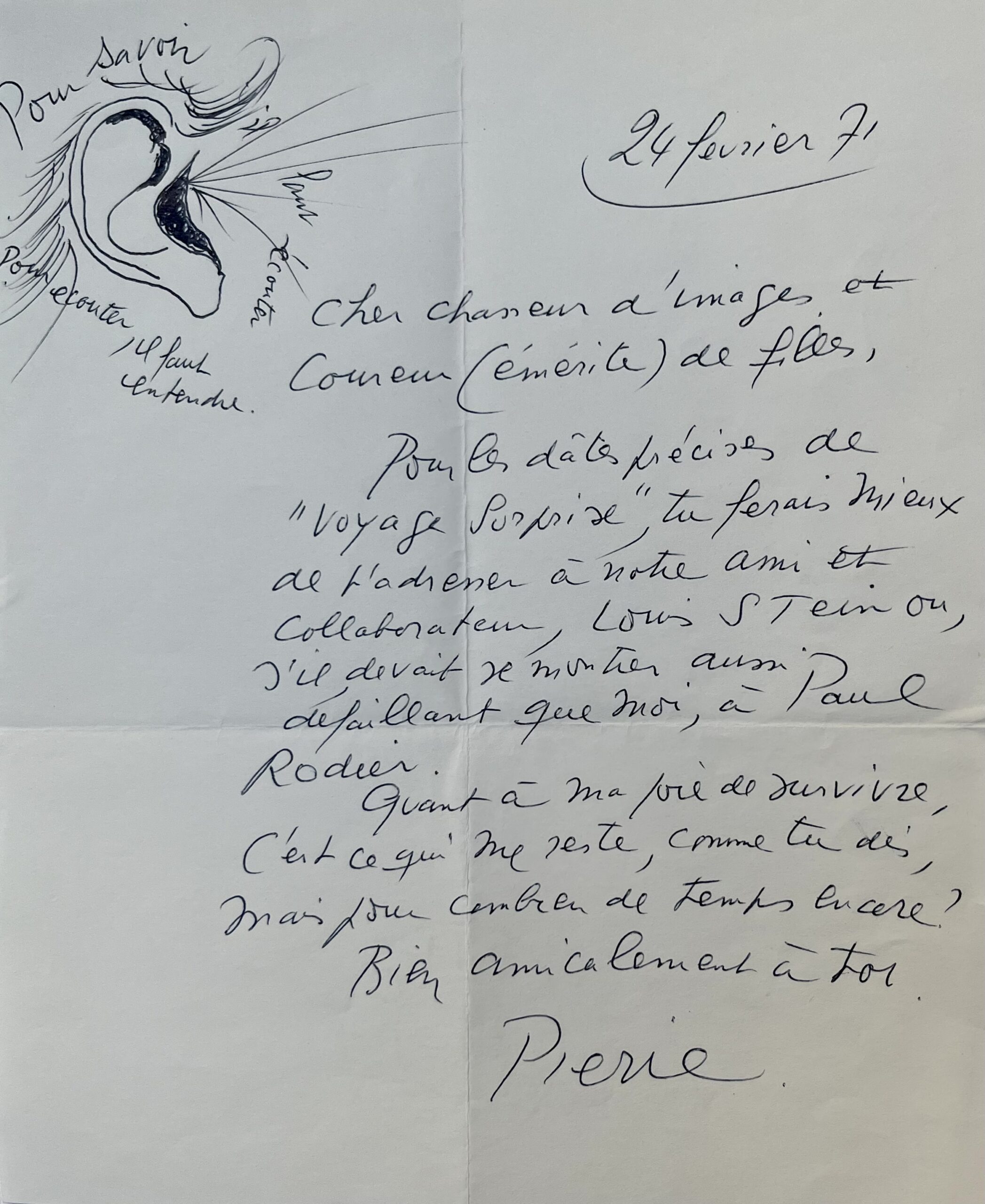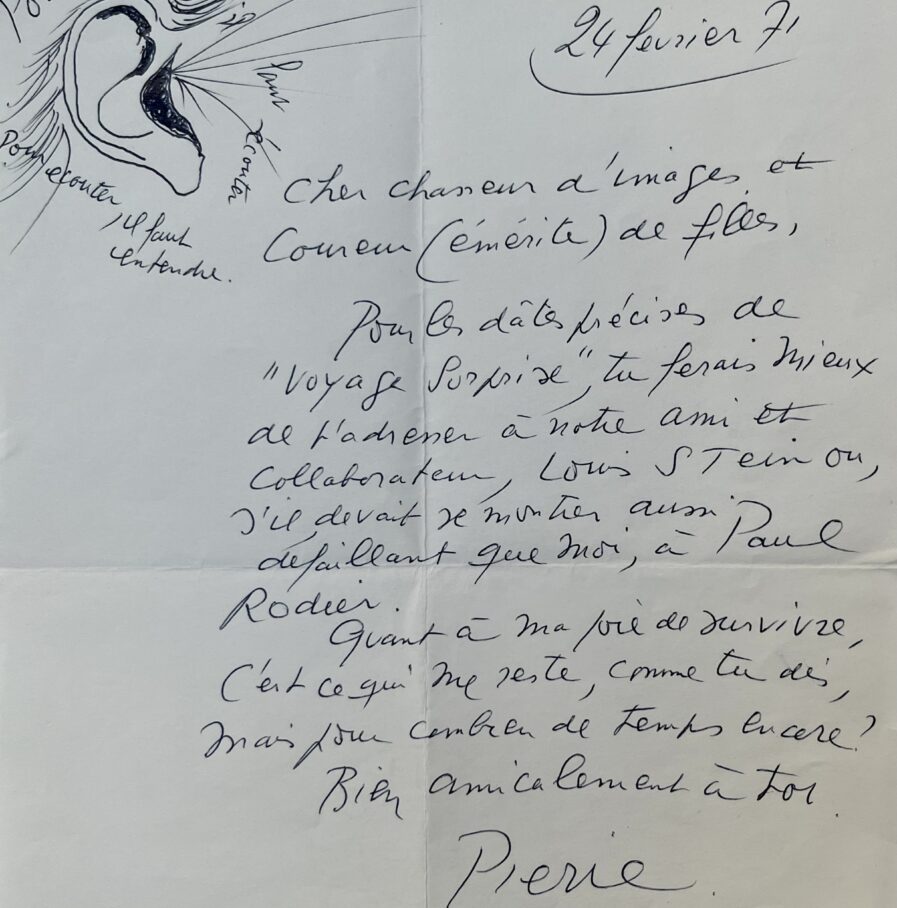 1971 : "Cher chasseur d'images et coureur (émérite) de filles. Pour les dates précises de "Voyage surprise", tu ferais mieux de t'adresser à notre ami et collaborateur, Louis Stein ou, s'il devait se montrer aussi défaillant que moi, à Paul Rodier. Quant à ma joie de survivre, c'est ce qui me reste, comme tu dis, mais pour combien de temps encore ?". Pierre Prévert a illustré ce courrier d'un dessin représentant une oreille, légendé : "Pour savoir, il faut écouter pour écouter il faut entendre".