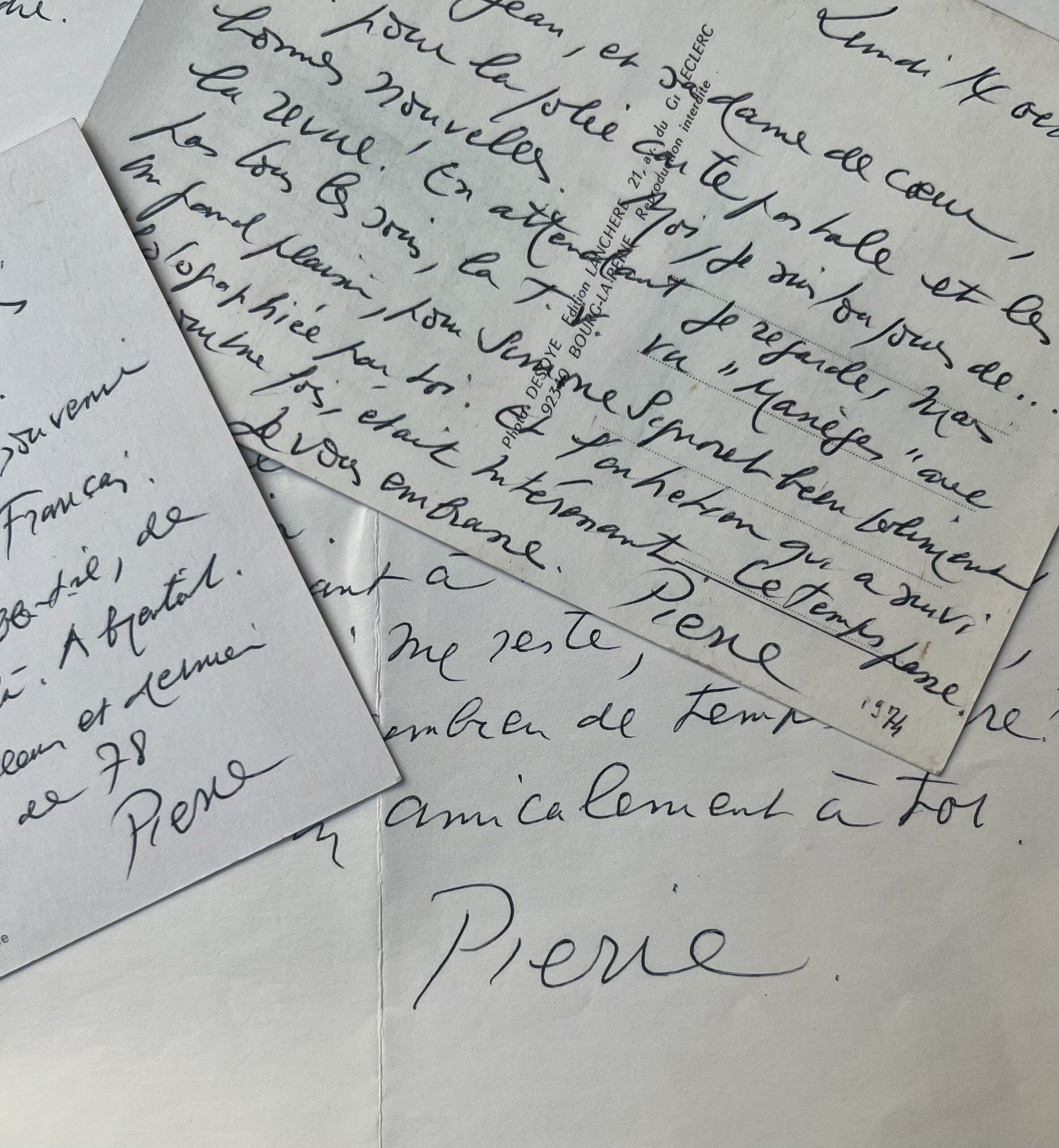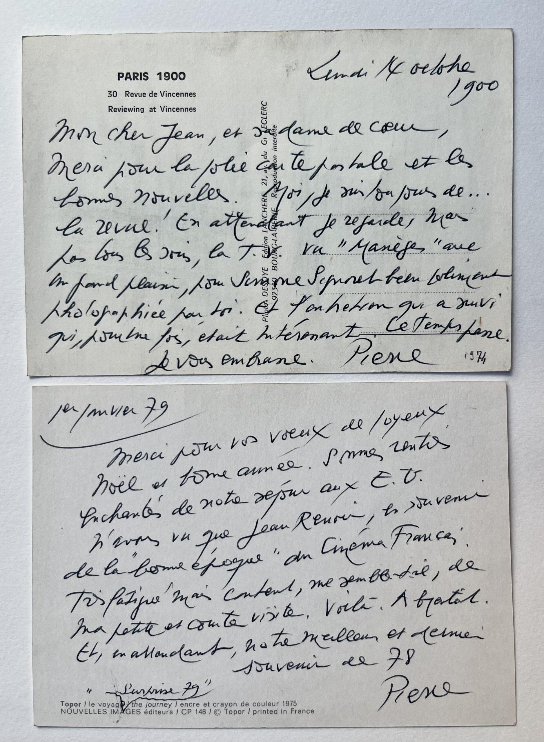 Carte postale de "Paris 1900" avec mention factice de la date "Lundi 14 octobre 1900" [1974] : "Mon cher Jean et sa dame de coeur. Merci pour la jolie carte postale et les bonnes nouvelles. Moi je suis toujours de... la revue ! En attendant je regarde, mais pas tous les soirs, la T.V. Vu "Manèges" avec un grand plaisir, pour Simone Signoret bien joliment photographiée par toi . Et l'entretien qui a suivi qui, pour une fois, était intéressant. Le temps passe. Je vous embrasse. Pierre".
