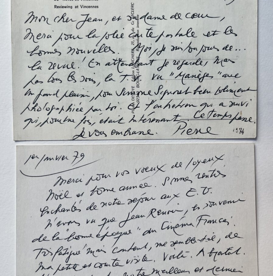 Autre carte postale de voeux, datée du 1er janvier 1979 : "Merci pour vos voeux de joyeux Noël et bonne année. Sommes rentrés enchantés de notre séjour aux E.U. N'avons vu que Jean Renoir, en souvenir de la "bonne époque" du cinéma français. Très fatigué mais content, mais content, me semble-t-il, de ma petite et courte visite [...]". [Jean Renoir décèdera un mois plus tard, le 12 février 1979].