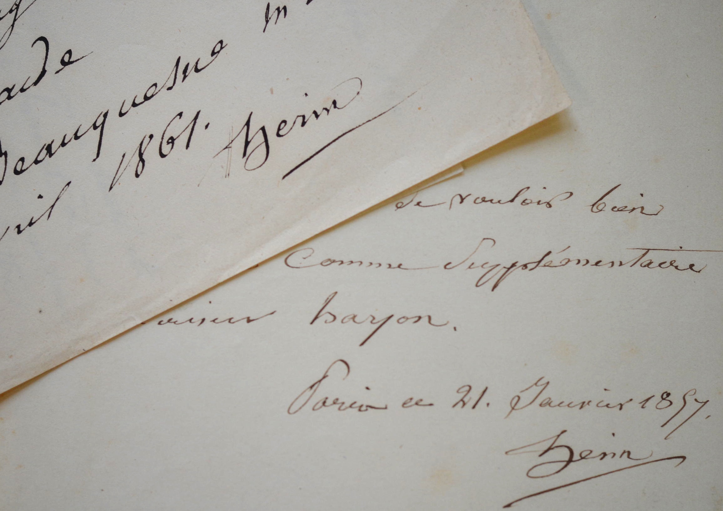 François-Joseph Heim se voit contraint de refuser une proposition : « Le mauvais état de ma santé et mes occupations me forcent à ne pas accepter la proposition que vous voulez bien me faire par la lettre que vous m'avez adressée. » Les deux autres billets, adressés à l'administration de l'Ecole des Beaux-Arts, témoignent des activités de professeur de François-Joseph Heim qui autorise MM. Bellangé, Caussade et de Bauquesne à suivre les cours de dessins du semestre estival et M. Bayon à être inscrit comme supplémentaire.