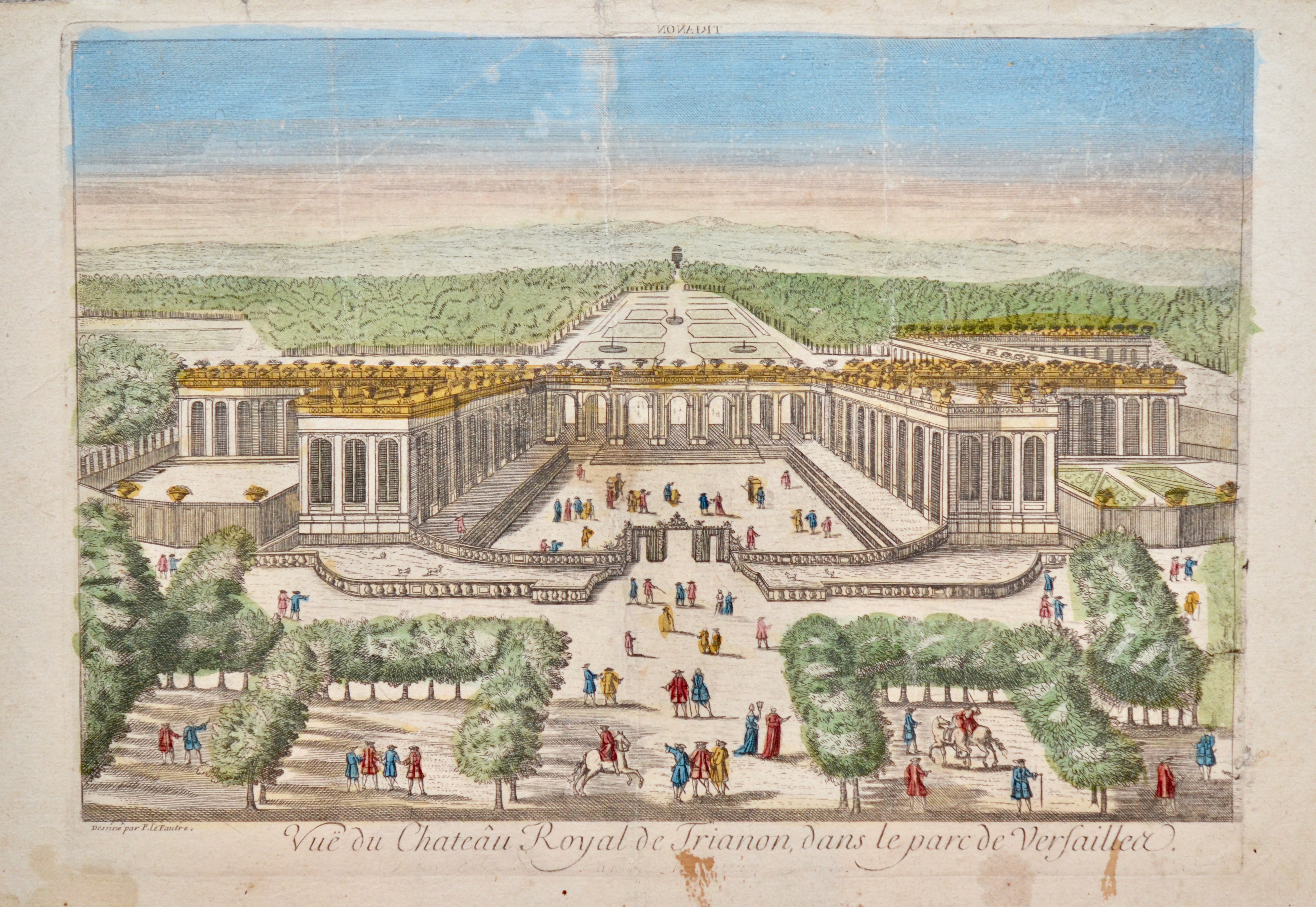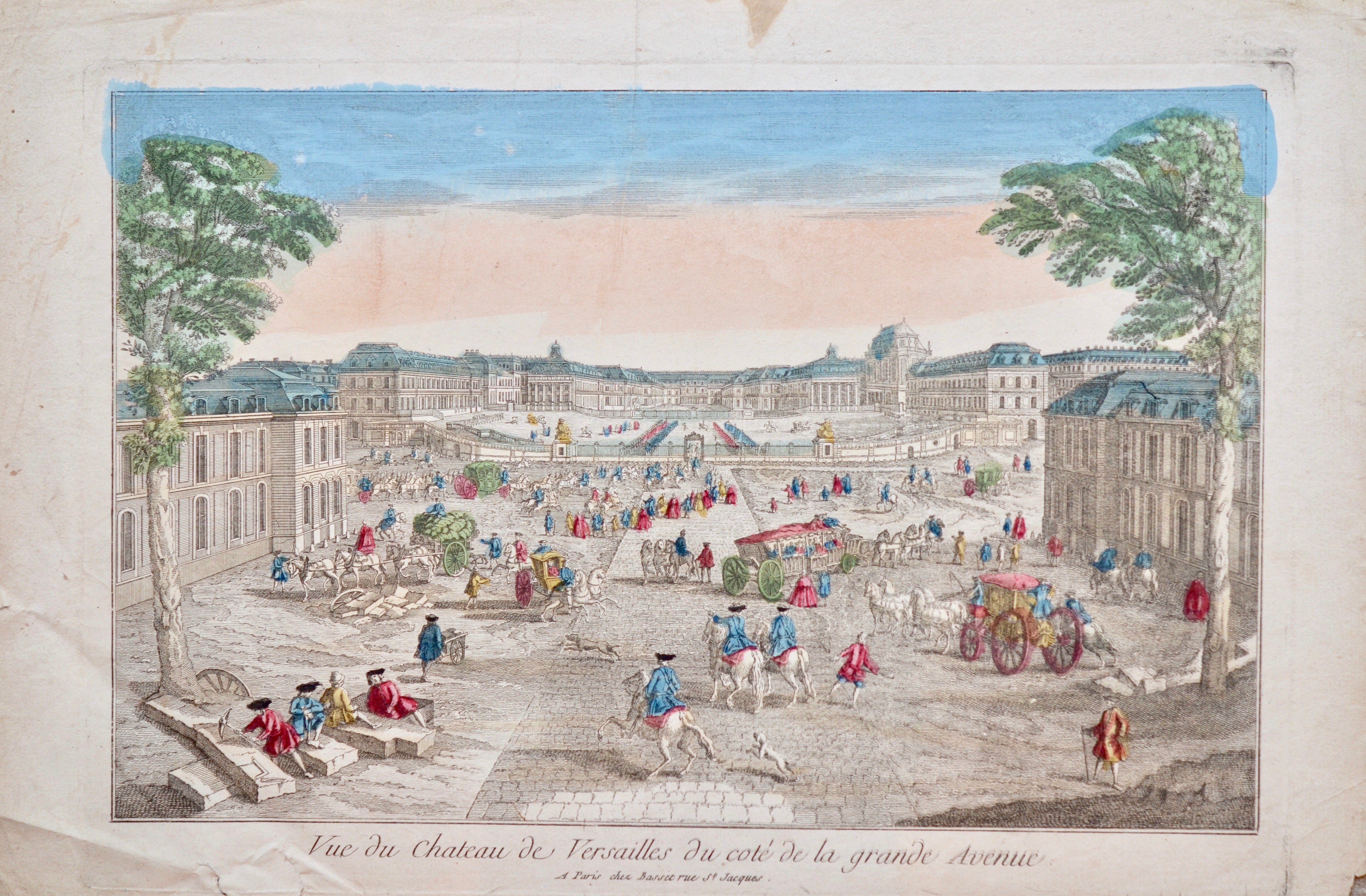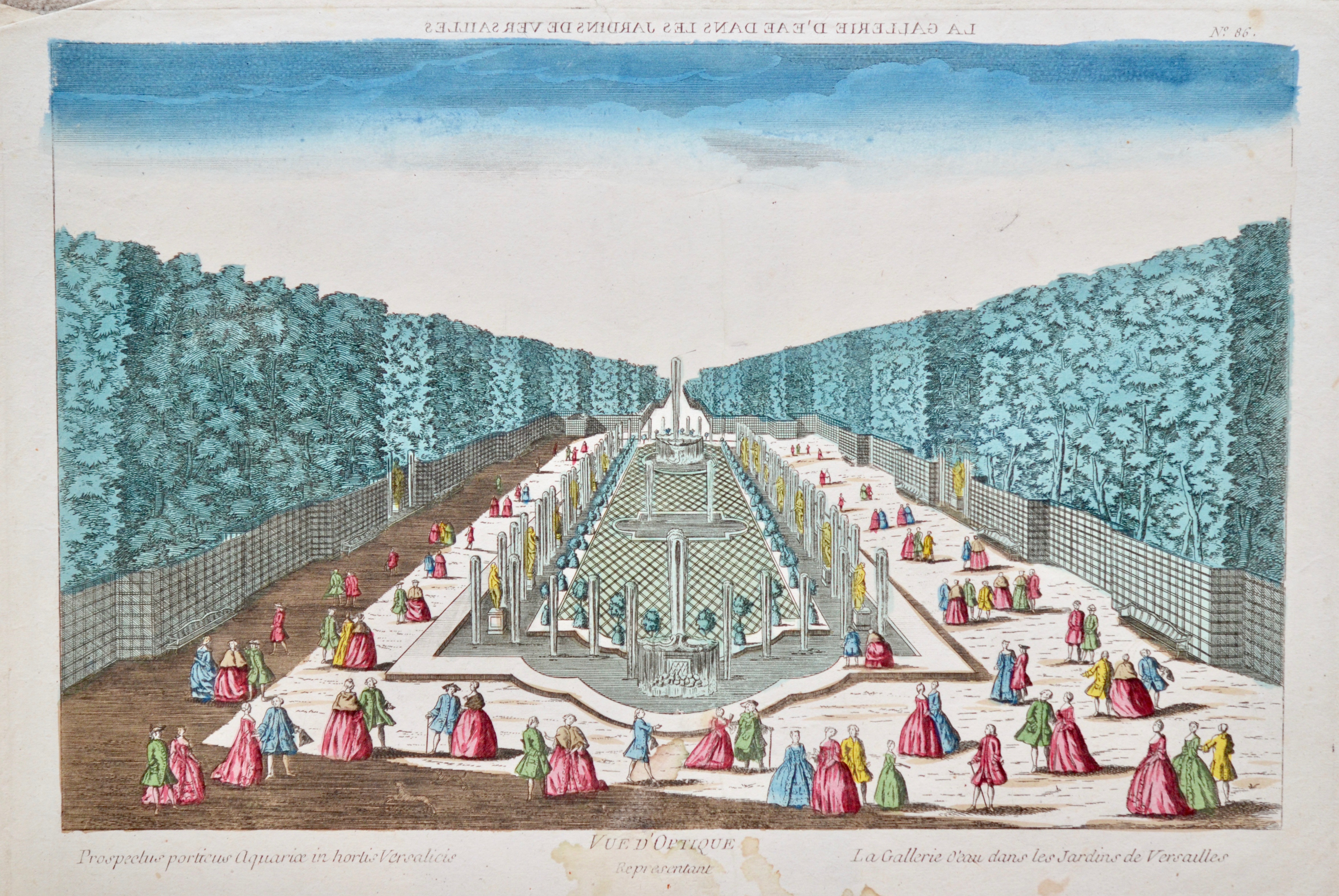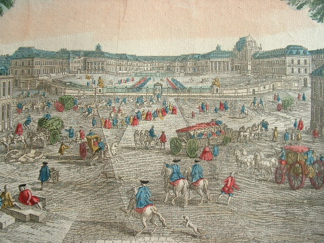 Trois vues d'optique, très animées, rehaussées d'aquarelle, du château et des jardins de Versailles. "Vue du château de Versailles du côté de la grande avenue" ; "La gallerie d'eau dans les jardins de Versailles" et "Vue du château royal de Trianon dans le parc de Versailles".