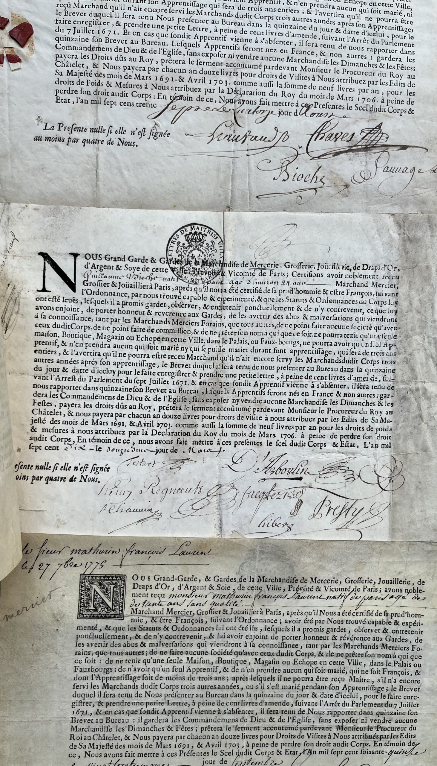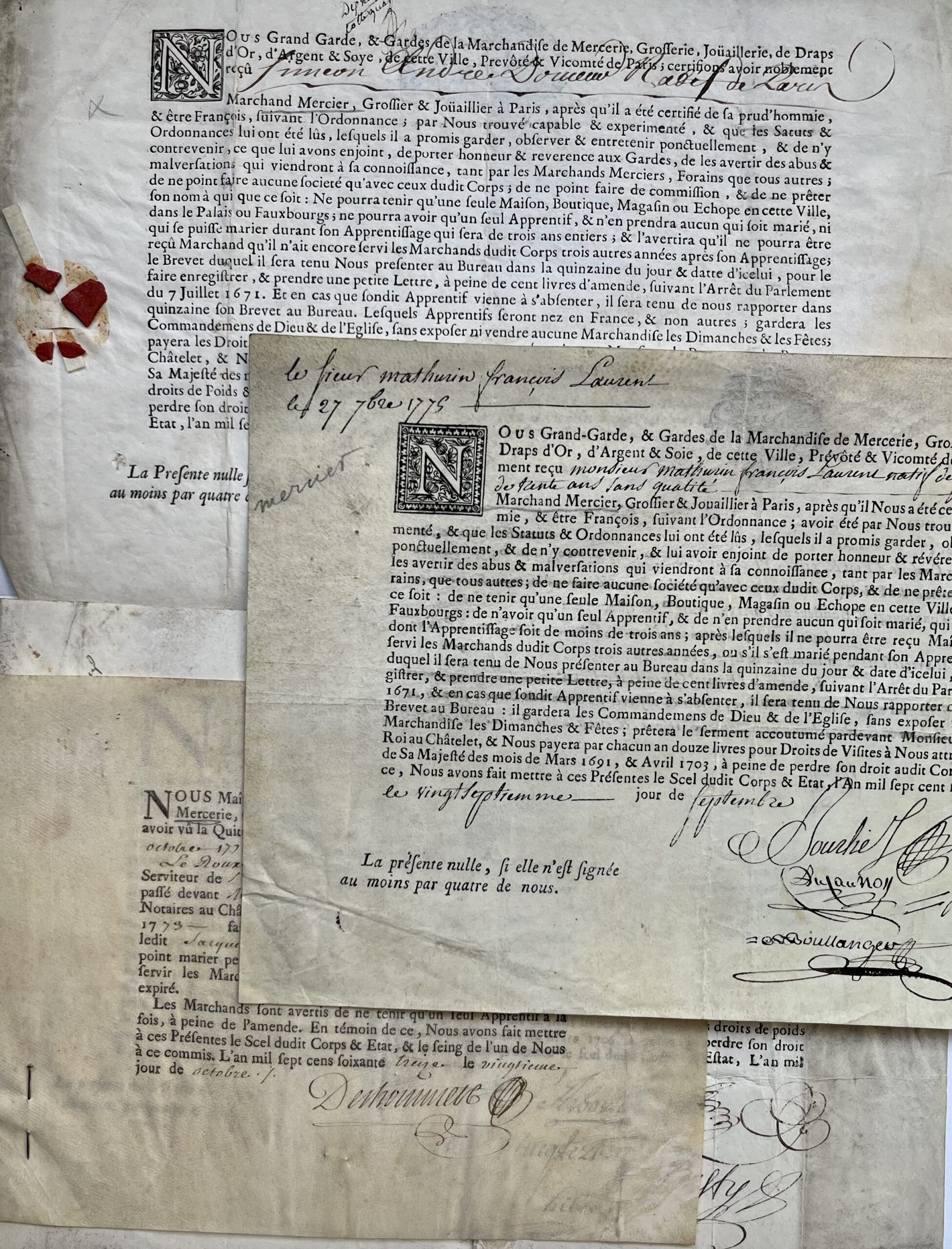 -1775 : brevet de "Mercier, Grossier & Joüaillier, de draps d'Or, d'Argent & Soye" décerné à Mathurin François Laurent, natif de Paris.