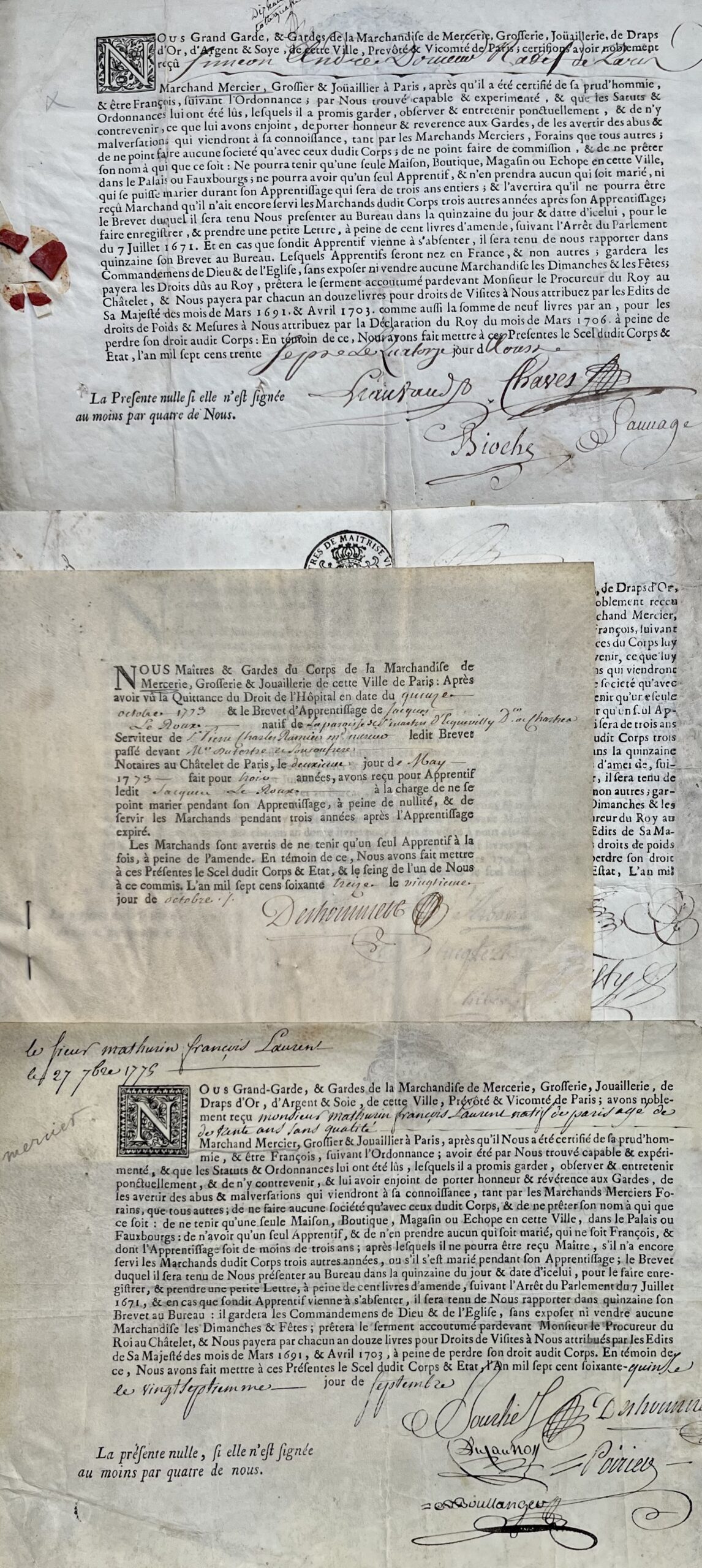 Ensemble de quatre documents signés sur parchemin, en parti imprimés, relatifs aux marchands de "Mercerie, Grosserie & Joüaillerie", signés par les "gardes" de la corporation.