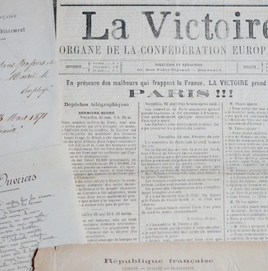 - Rare journal bordelais La Victoire, organe de la confédération européenne du 26 mai 1871, imprimé avec liseré de deuil. 4 pp. 36,5 x 25,5 cm.