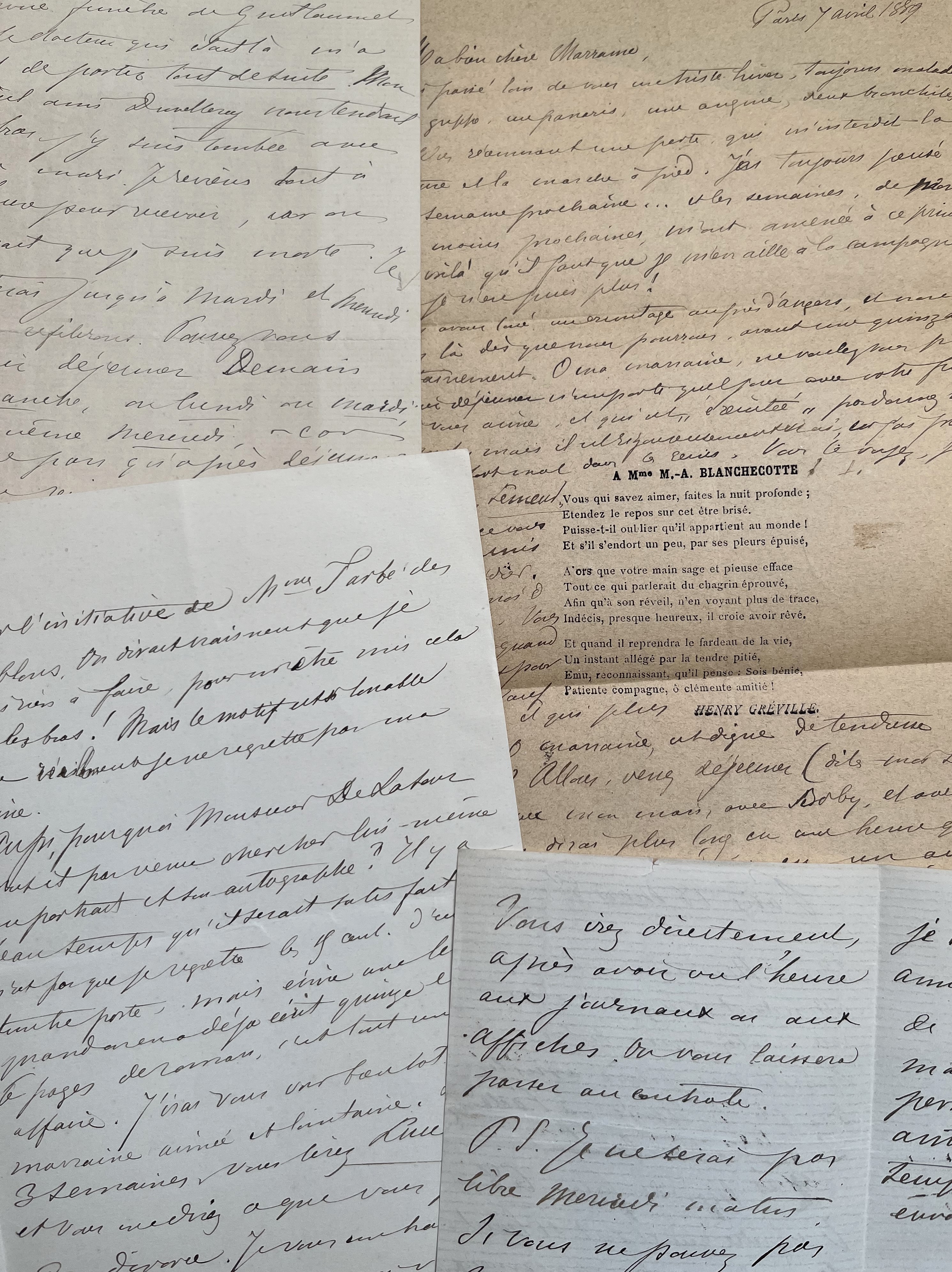 Henry Gréville (Paris , 1842 /1902 )Ensemble de quatre lettre d'Alice Fleury dite Henry Gréville, adressées à sa marraine. Elles sont signées "Alice", "H Gréville" ou "A Durand Gréville".