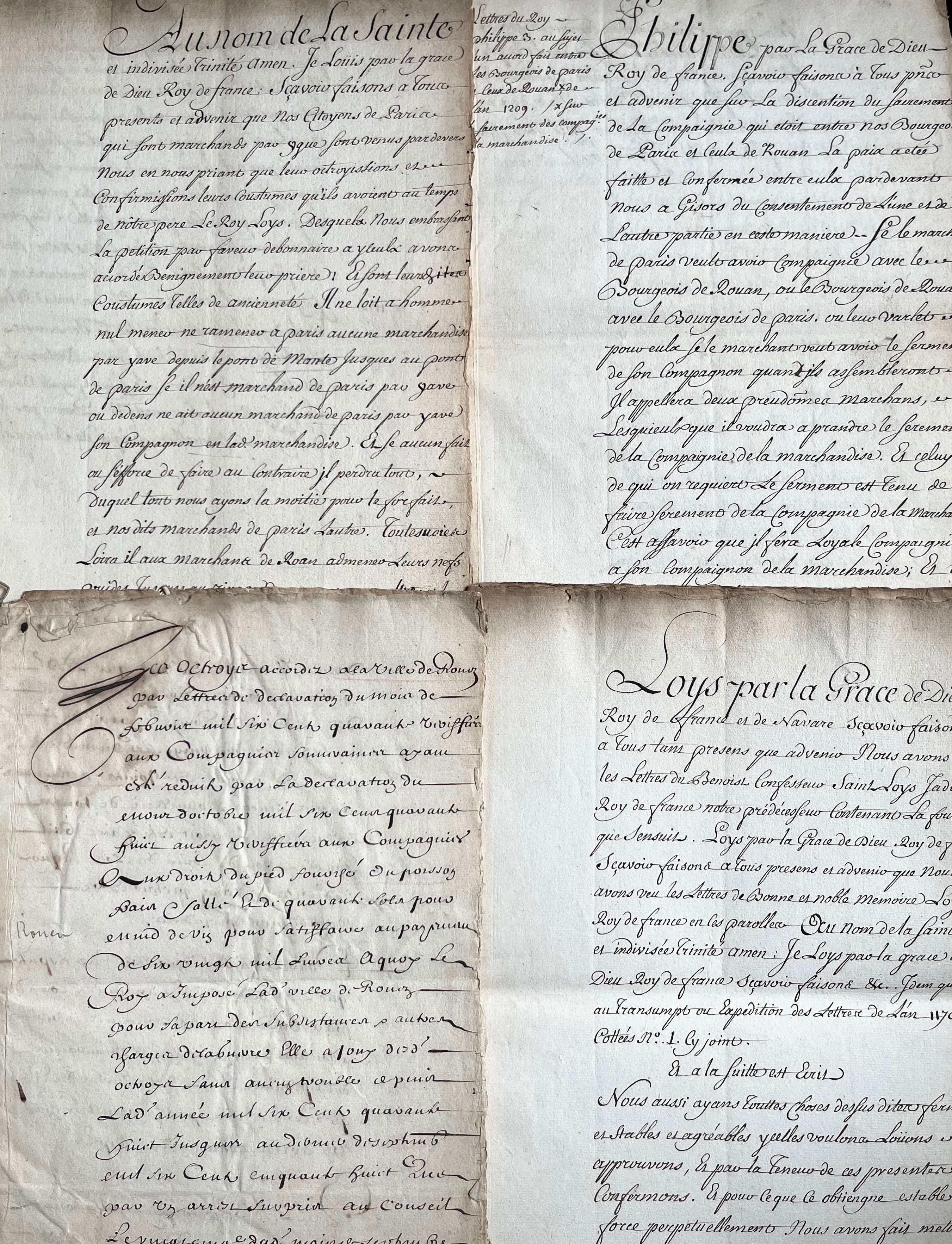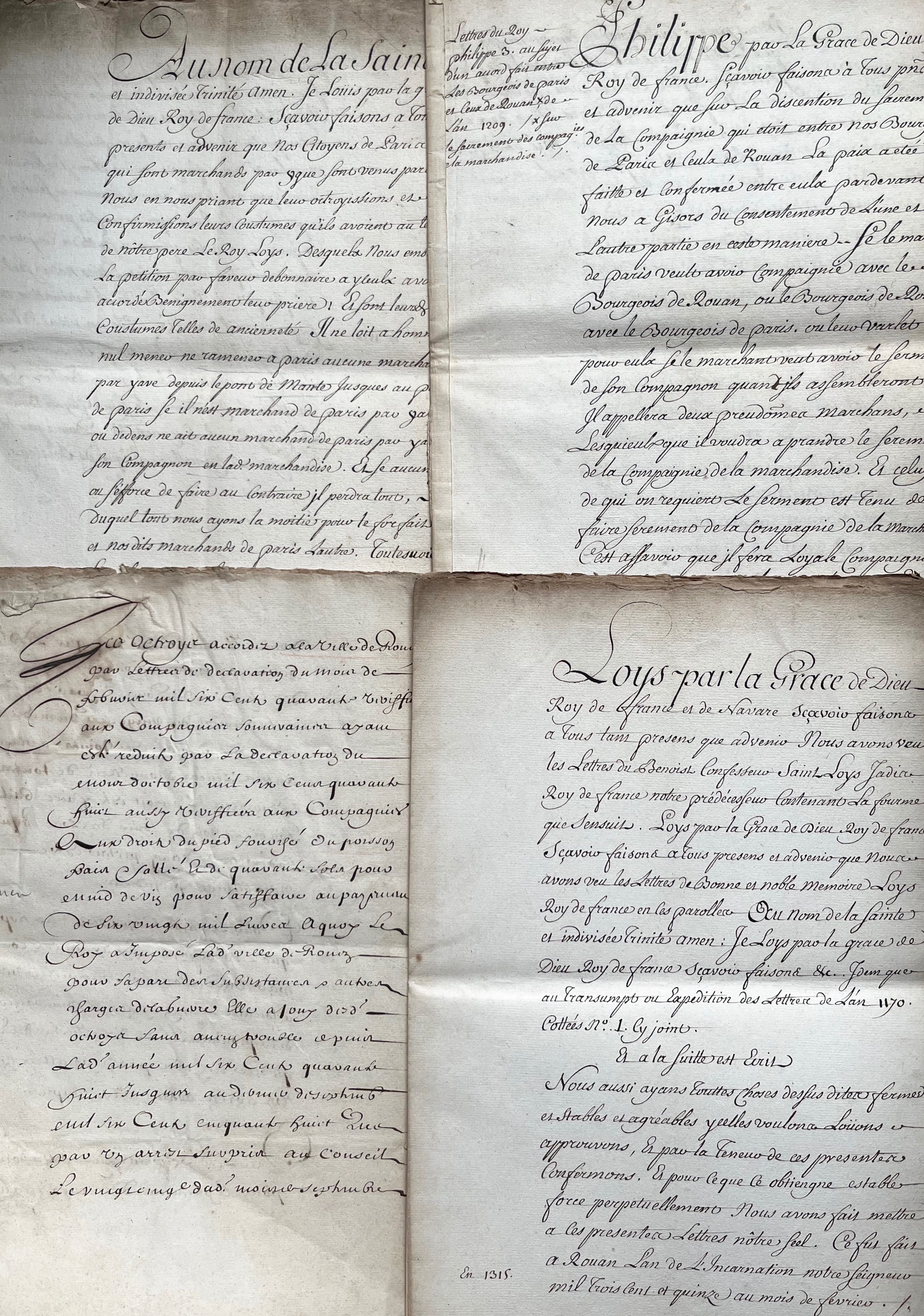 Manuscrit de 6 pp. in-folio de 1648 détaillant les conditions de l'octroi accordé à la ville de Rouen « aux droits du pied fourché du poisson frais sallé », accompagné de 4 copies anciennes (12 pp. in-folio) des lettres patentes du roi Philippe III promulguées en 1209 « au sujet d'un accord fait entre les bourgeois de Paris et ceux de Rouen sur le sacrement des compagnies de la marchandise » et leurs ratifications par les rois successifs jusqu'en 1315.
