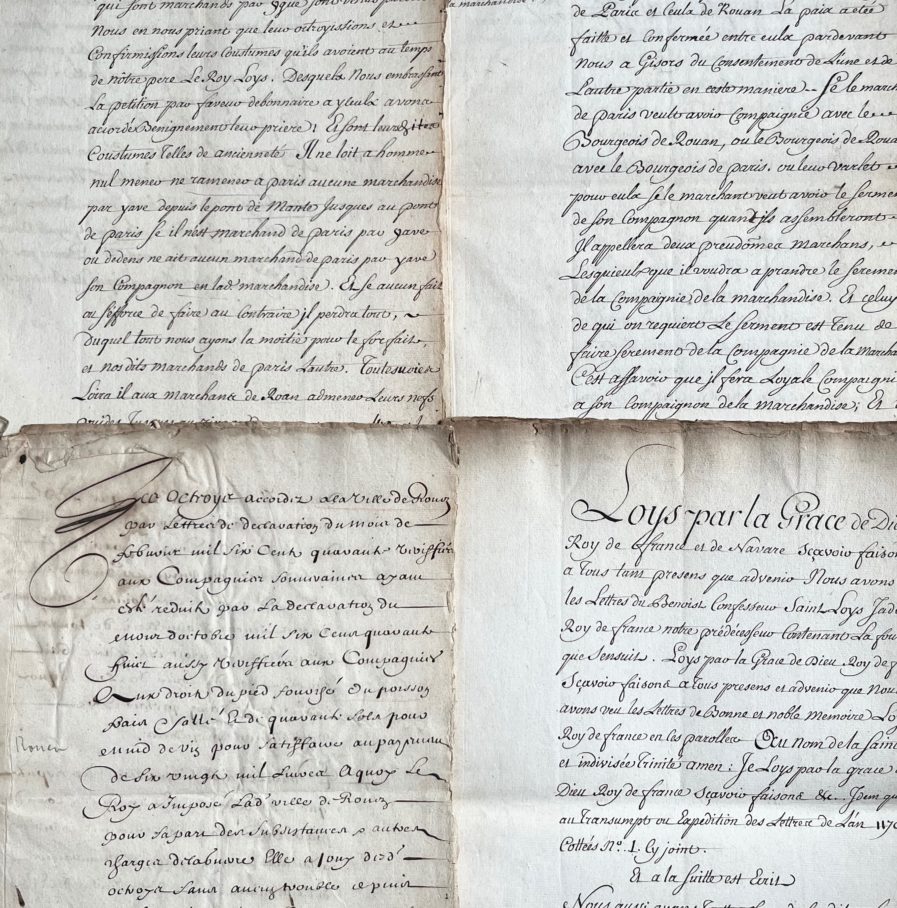 Manuscrit de 6 pp. in-folio de 1648 détaillant les conditions de l'octroi accordé à la ville de Rouen « aux droits du pied fourché du poisson frais sallé », accompagné de 4 copies anciennes (12 pp. in-folio) des lettres patentes du roi Philippe III promulguées en 1209 « au sujet d'un accord fait entre les bourgeois de Paris et ceux de Rouen sur le sacrement des compagnies de la marchandise » et leurs ratifications par les rois successifs jusqu'en 1315.