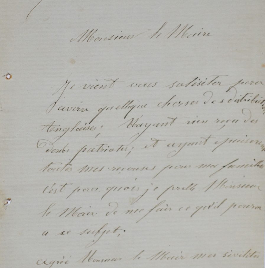 Théophile Cuillier, qui se signalera quelques semaines plus tard sur les barricades de la Commune, se disant "tailleur de pierre rue Gauthey 50 sans travaille depuis le mois d'août", demande de l'aide pour subvenir aux besoins de sa famille. "Je vient vous solisiter pour savoir quelleque chose des distributions Anglaises ; n'ayant rien reçu des deniés patriotiques, et ayant épuisé toutes mes resources pour ma famille [...]".