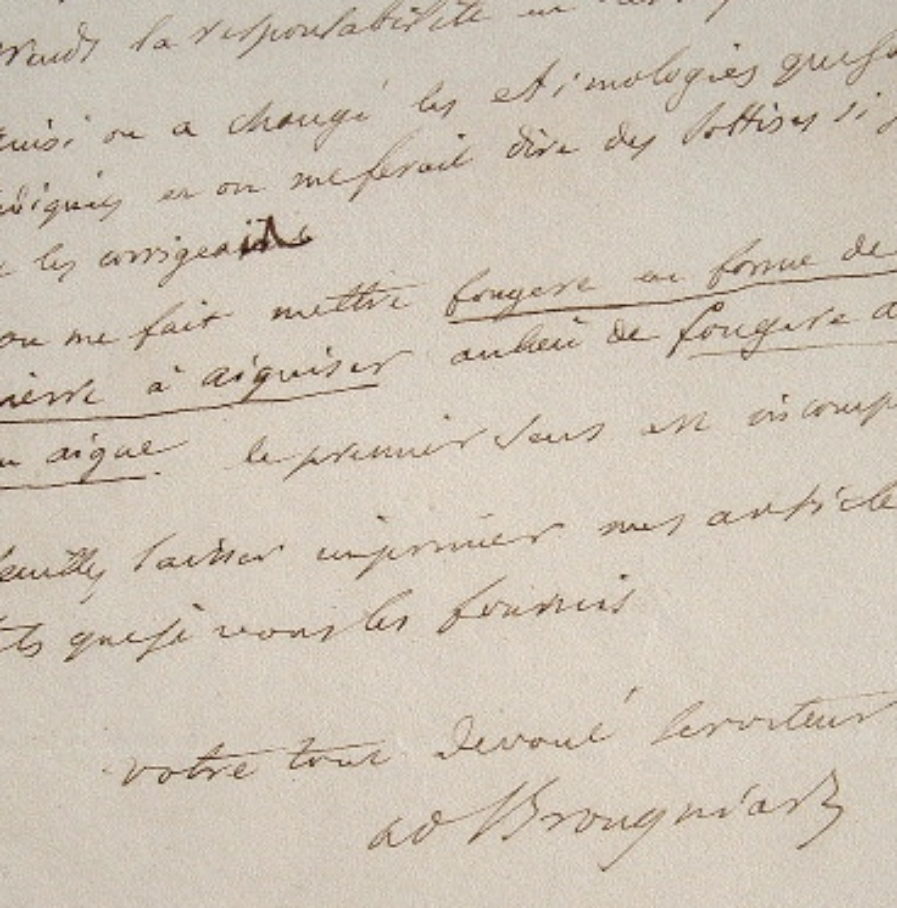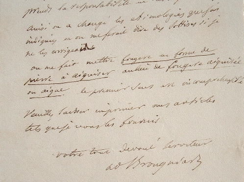 Adolphe Brongniart demande à ce qu'on lui retourne ses articles corrigés. "Je vous prierai de n'y faire par la suite ni d'y laisser faire de corrections soit pour le fond soit pour la forme, j'en prends la responsabilité en les signant". Il se plaint des modifications qui ont été faites à son texte : "Ainsi on a changé les étymologies que j'ai indiquées et on me ferait dire des sottises si je ne les corrigeais. On me fait mettre Fougère en forme de pierre à aiguiser au lieu de Fougère aiguisée ou aigüe. Le premier sens est incompréhensible. Veuillez laisser imprimer mes articles tels que je vous les fournis".