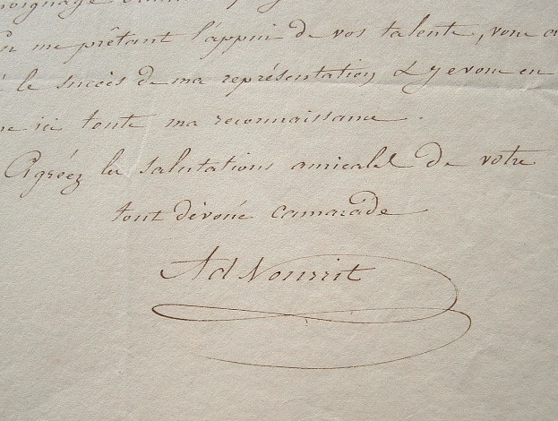 "Je m'empresse de vous offrir mes remerciements pour le témoignage d'amitié que je viens de recevoir de vous. En me prêtant l'appui de vos talents, vous avez assuré le succès de ma représentation et je vous en exprime toute ma reconnaissance [...]".