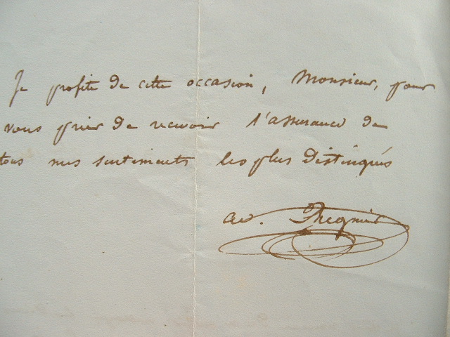 Adolphe Régnier remercie son correspondant pour l'envoi d'ouvrages destinés à faciliter l'enseignement de l'orthographe. «Je les connaissais déjà, car madame la Duchesse d'Orléans s'était empressée de me les communiquer l'année dernière. Votre méthode m'a paru très bonne, je l'ai suivie et je la suivrai encore dans mes leçons, et je ne doute pas qu'elle ne contribue beaucoup aux progrès du Prince. Je remettrai l'Abrégé à la gouvernante de Mgr le Duc de Chartres pour qu'elle voit si elle peut dès à présent s'en servir pour son élève [...]». [Précepteur de Phillipe d'Orléans comte de Paris (1838/1894), Adolphe Régnier suivit le prince en exil en 1848].