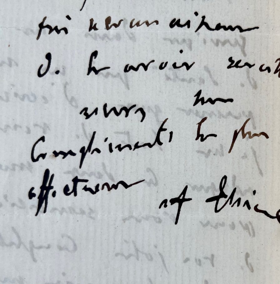 "Monsieur. Quoique dans un état de santé qui ne me permet guère d'écrire, je me hâte de vous adresser ces deux mots pour vous remercier de vos jolis couplets et des souvenirs que vous invoquez. Ces souvenirs me touchent vivement et je vous suis très reconnaissant de les avoir réveillés [...]".