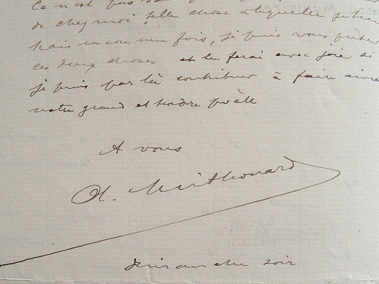 Adrien Mithouard (Paris, 1864/1919)Mithouard accepte avec plaisir de participer au monument de Moréas. «Je suis en train de commencer une campagne contre les statues qui deshonorent la ville. Je ne doute pas que celle-ci ne soit belle comme elle le doit. Mais, à cause de cela même, et pour que Moréas soit consacré par un souvenir juste autant que grand, il sera bon de s'entendre [...]». Il compte assister à la conférence sur Verlaine de son correspondant. «Je n'ai pas de souvenir important sur Verlaine à mettre à votre disposition, sinon la belle lithogr. de Carrière et l'un des 5 exemplaires du moulage fait par Cazals sur son lit de mort [...]. On m'a volé, l'an dernier, un superbe Constantin Guys à une exposition. Ce n'est pas sans peine que je vois sortir de chez moi telle chose à laquelle je tiens [...]».