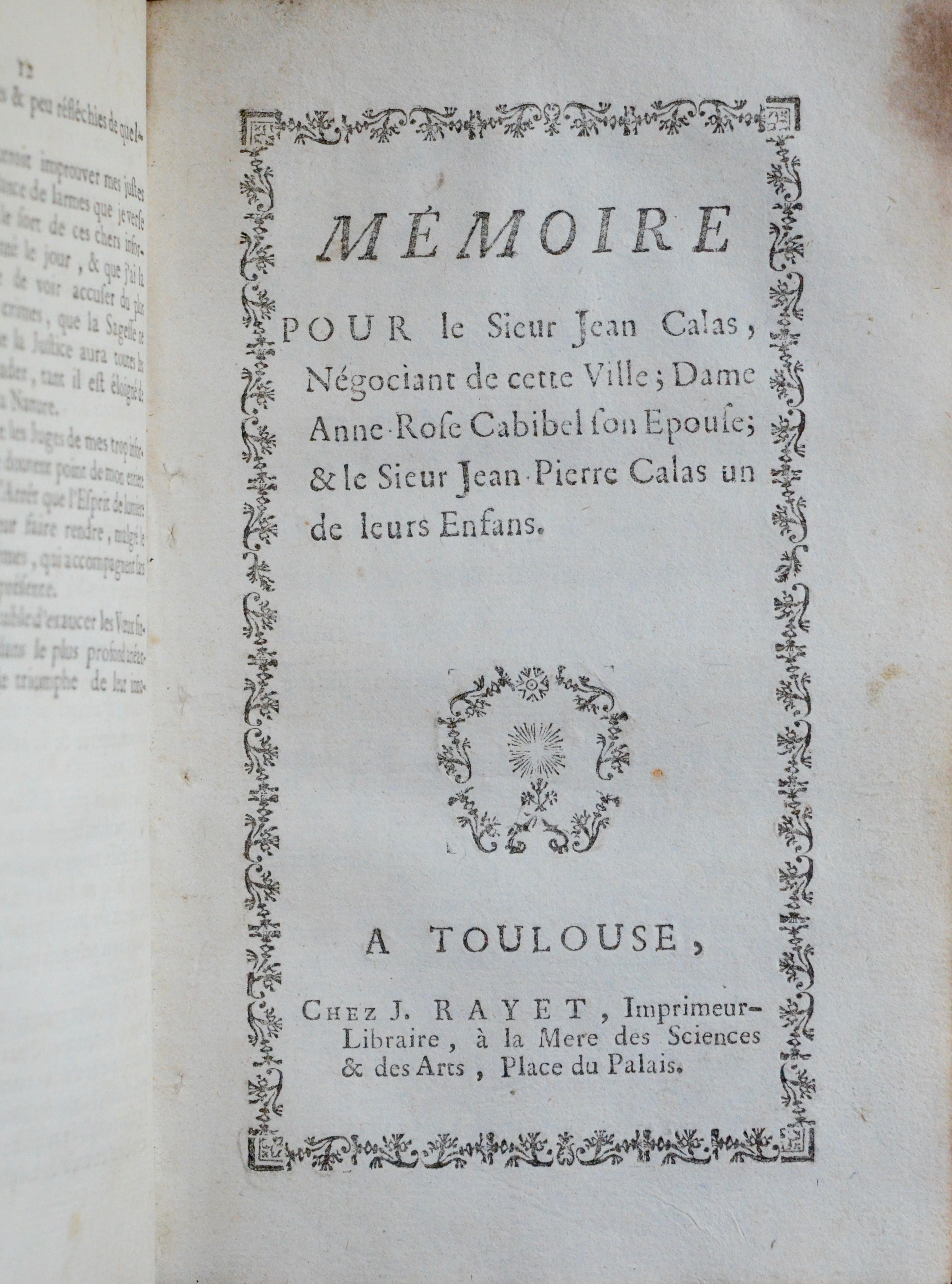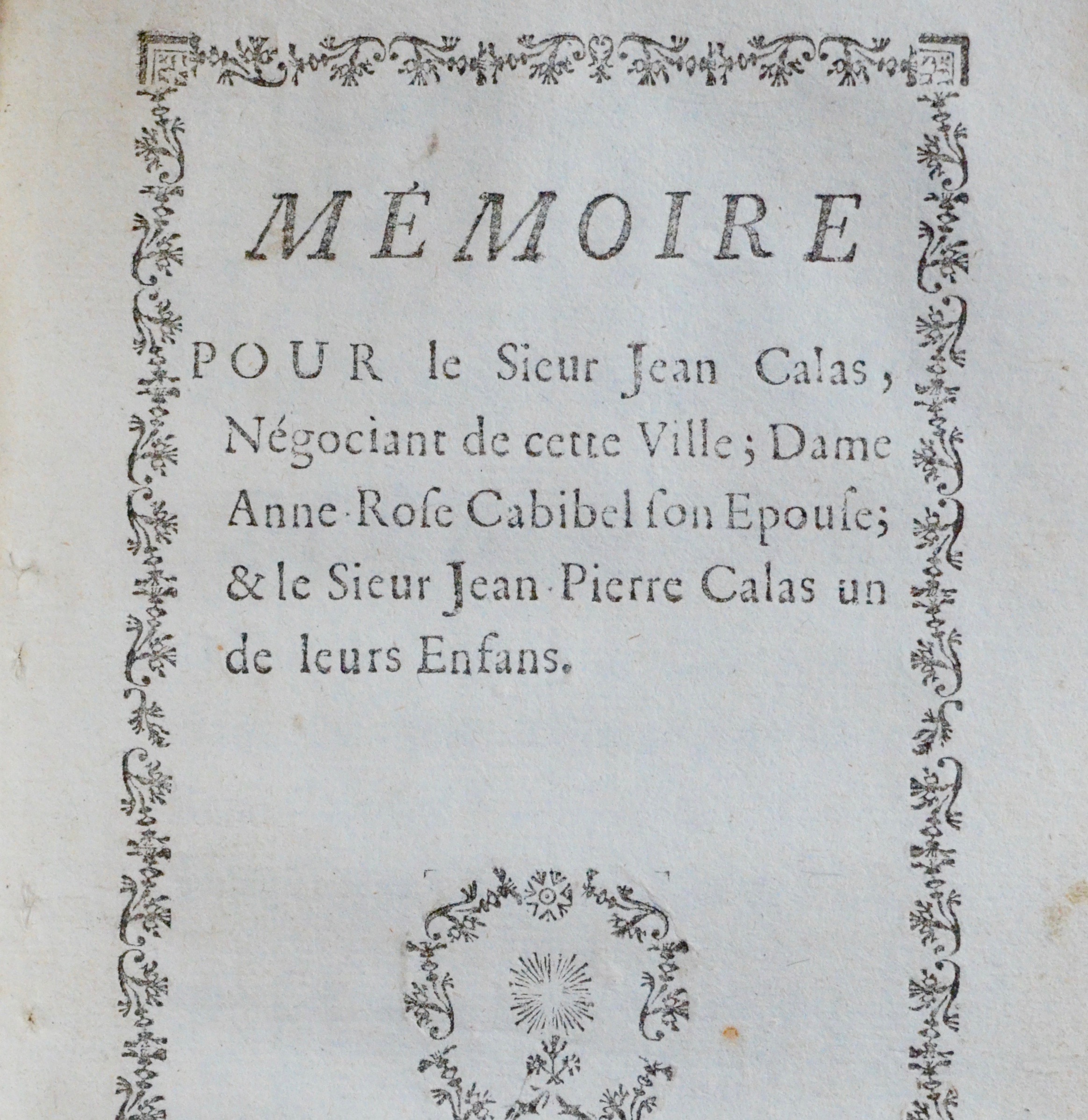 - Mémoire pour le sieur Jean Calas, négociant de cette ville ; Dame Anne Rose Cabibel son épouse ; & le sieur Jean Pierre Calas un de leurs enfants. Toulouse, J. Rayet, s.d.