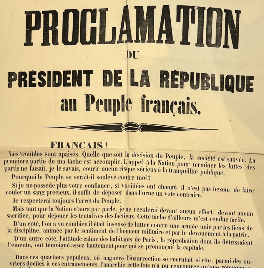Exemplaire de l'affiche placardée par le futur Napoléon III, après son coup d'état le 2 décembre 1851 :